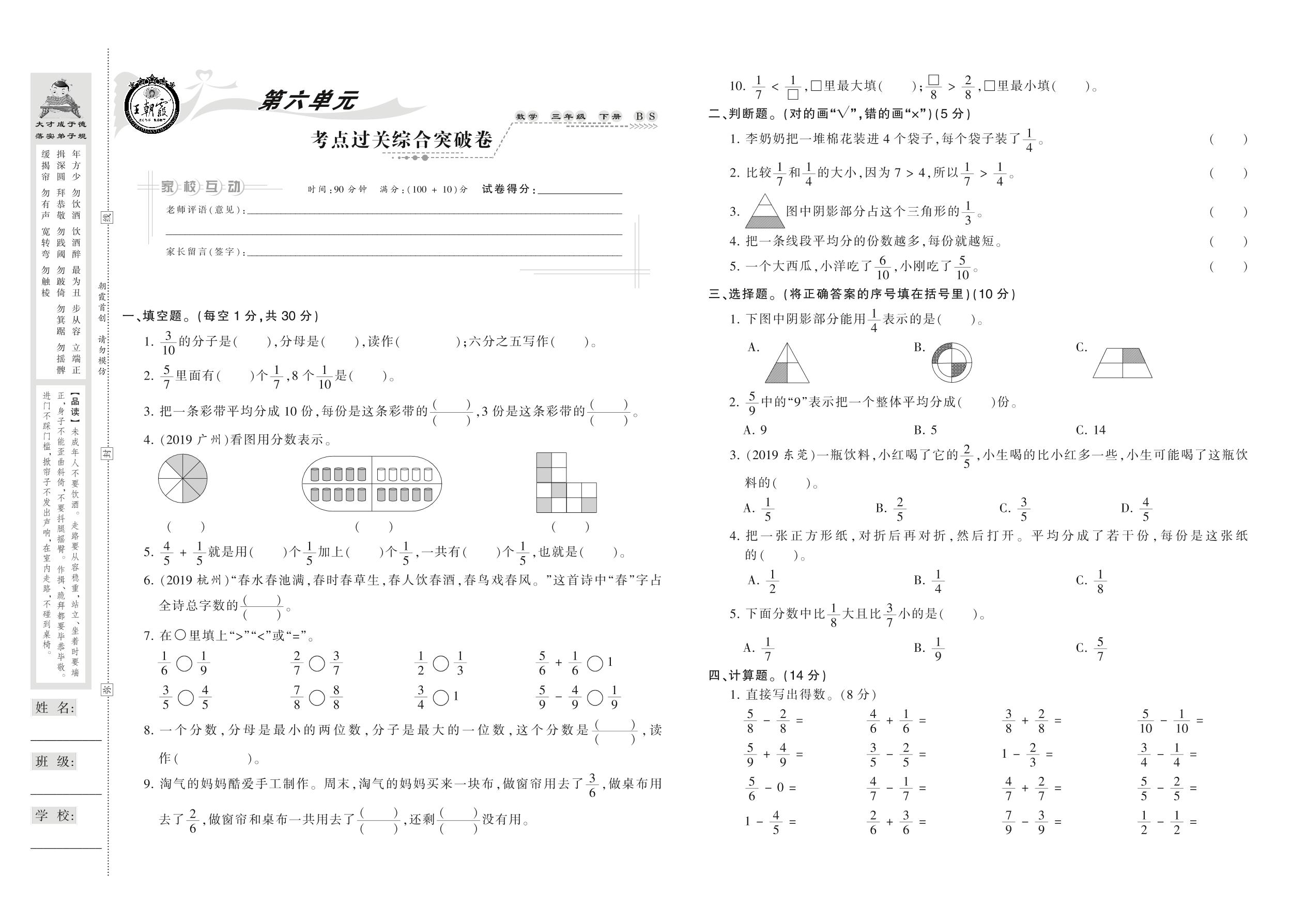 2021下册三年级数学北师版 第六单元 考点过关综合突破卷