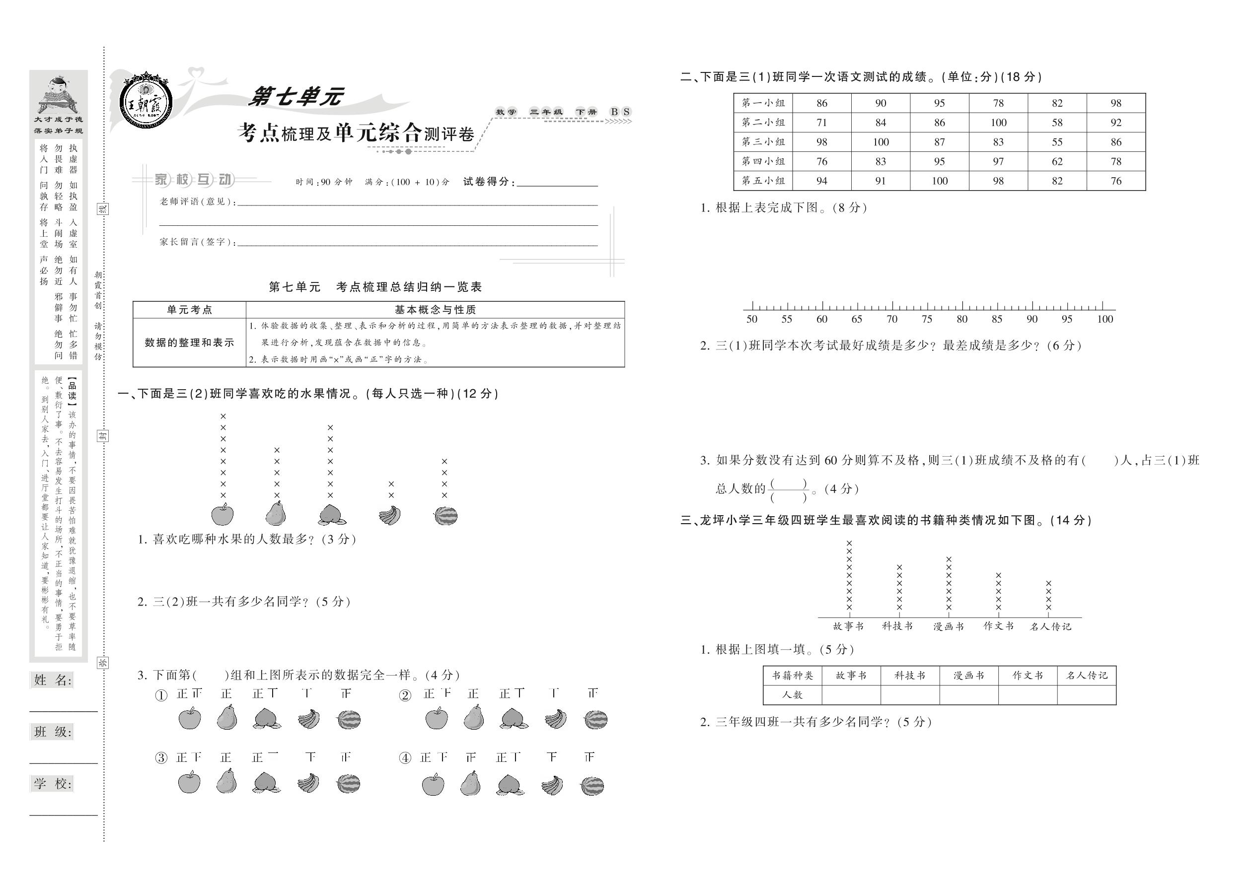 2021下册三年级数学北师版 第七单元 考点梳理及单元综合测评卷