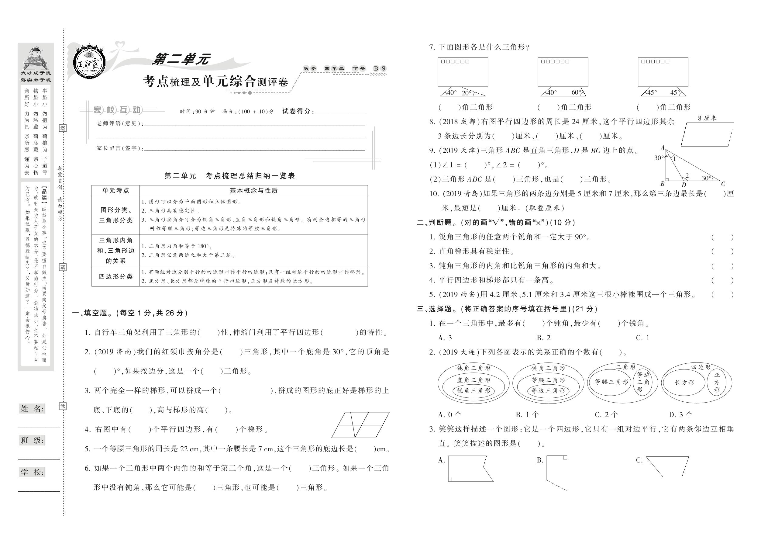 2021下册四年级数学北师版 第二单元 考点梳理及单元综合测评卷