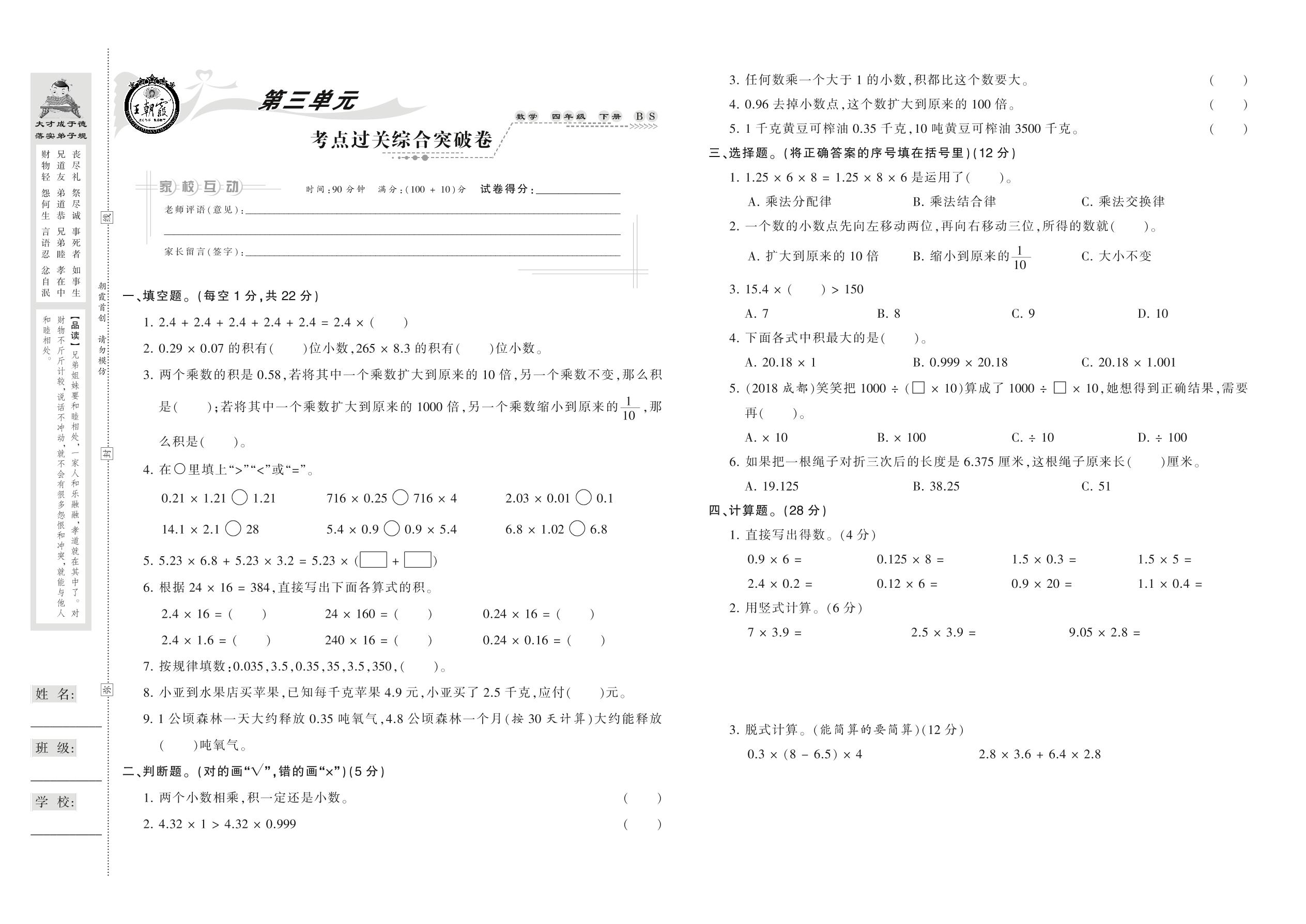 2021下册四年级数学北师版 第三单元 考点过关综合突破卷