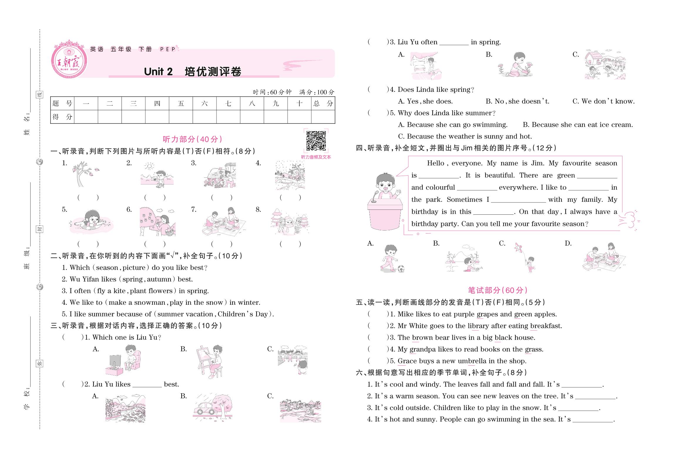 2021下册五年级英语PEP版 Unit 2 培优测评卷