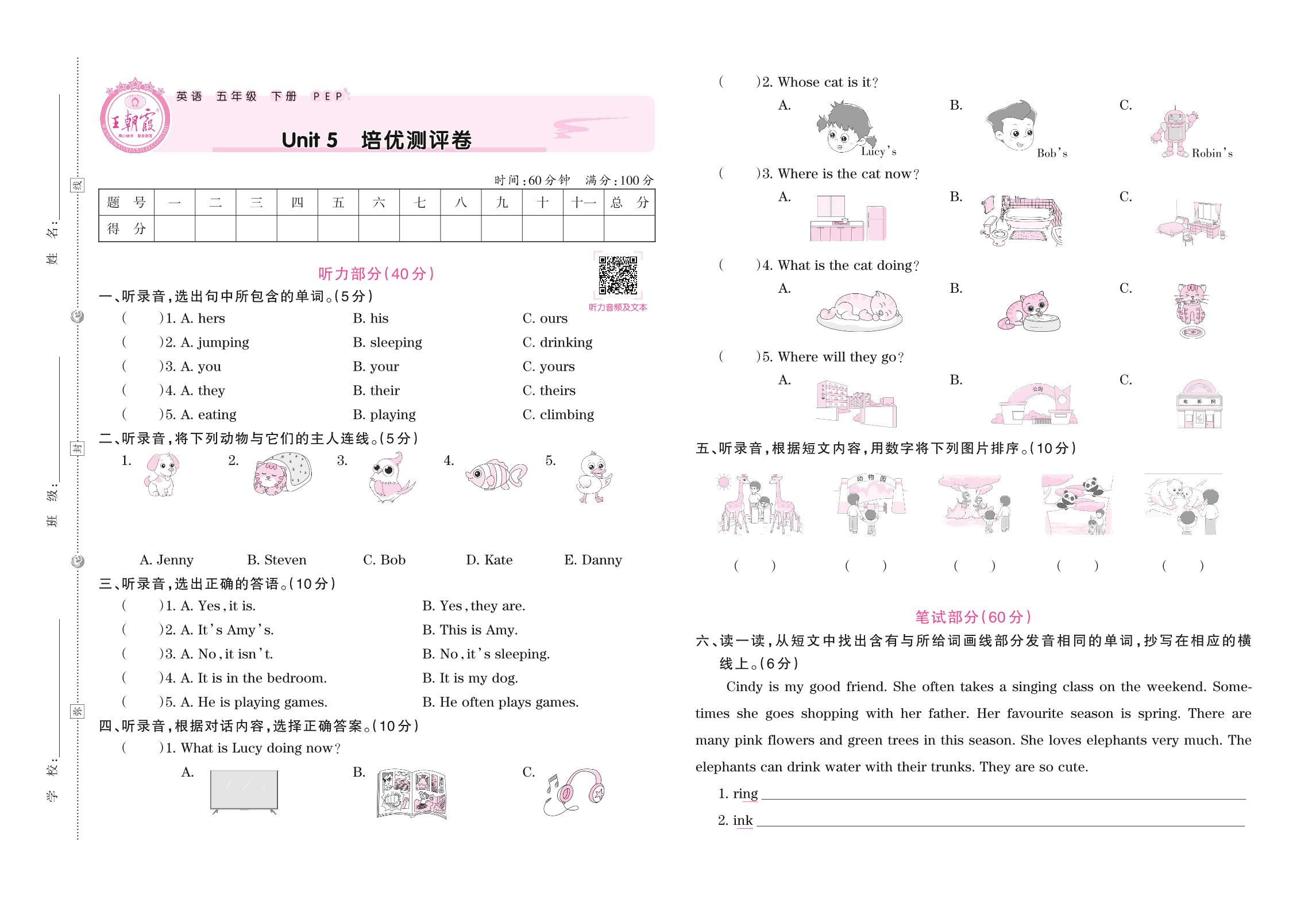 五年级英语人教PEP版(三起始)下册单元卷