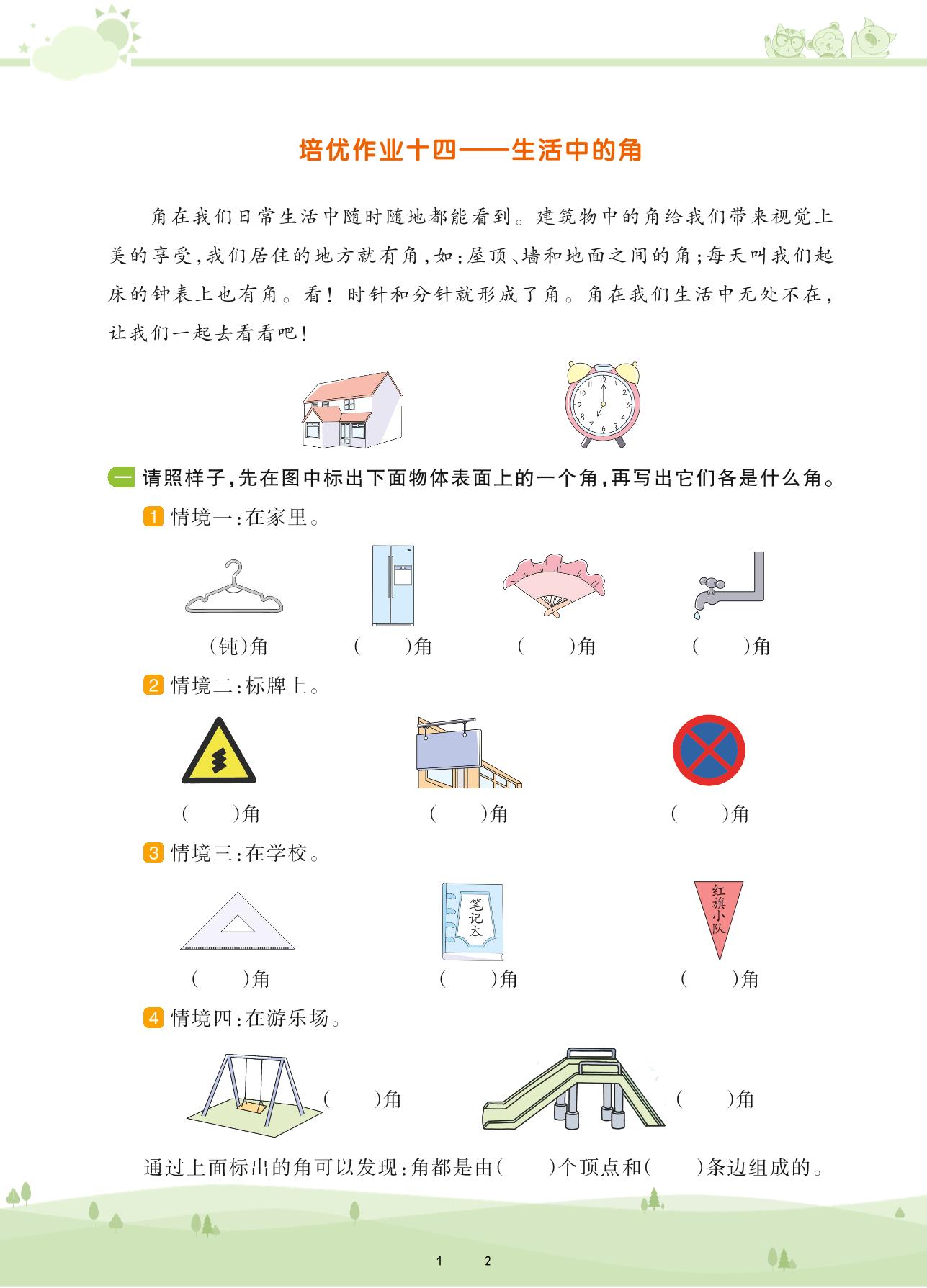 2021下册二年级数学北师版 第六单元 认识图形——培优作业十四 生活中的角