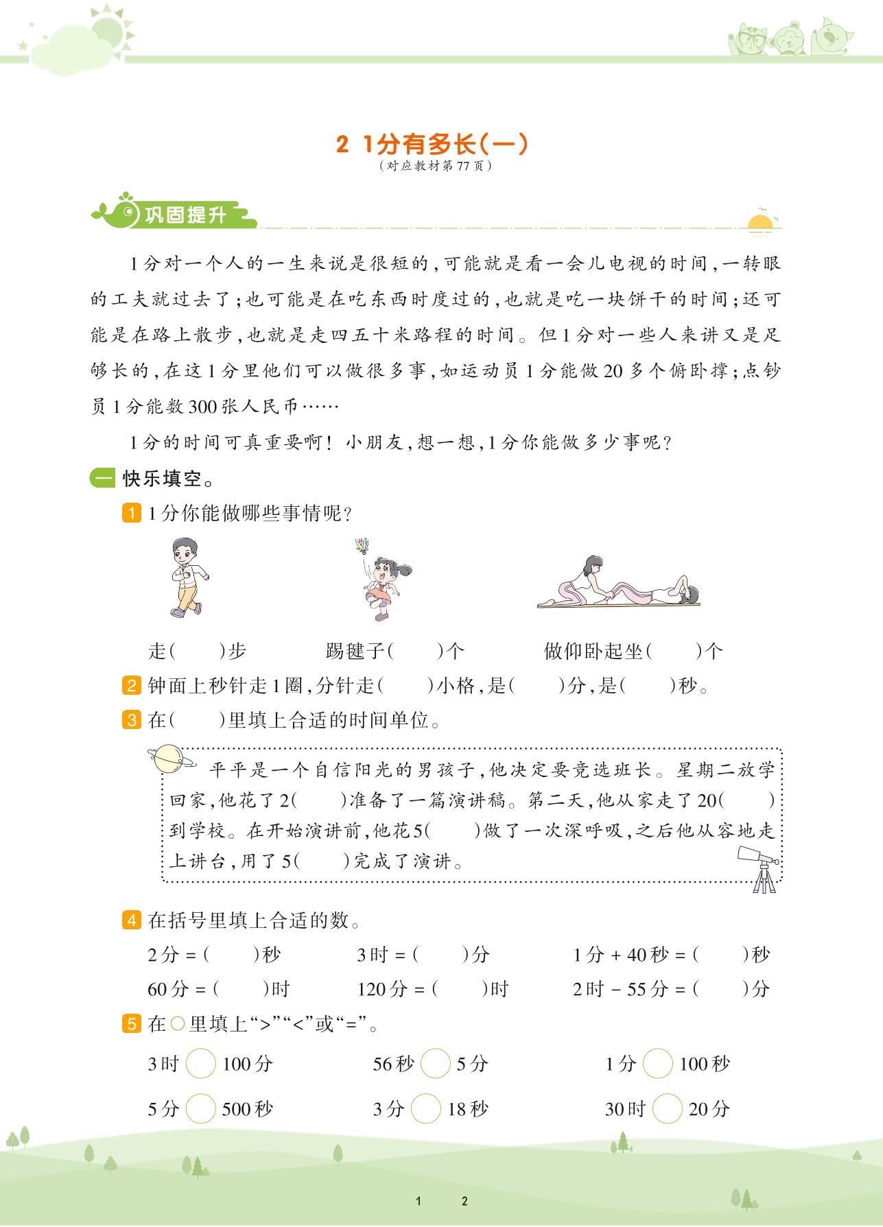 2021下册二年级数学北师版 第七单元 时、分、秒——2 1分有多长(一)