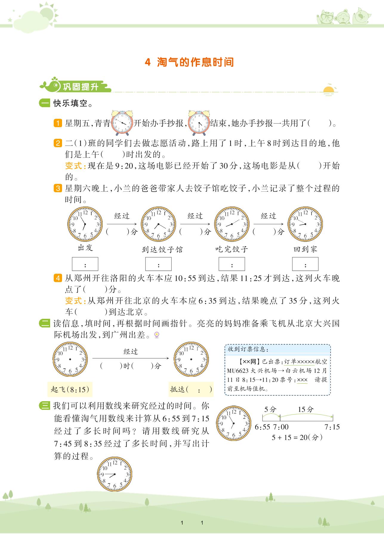 2021下册二年级数学北师版 第七单元 时、分、秒——4 淘气的作息时间