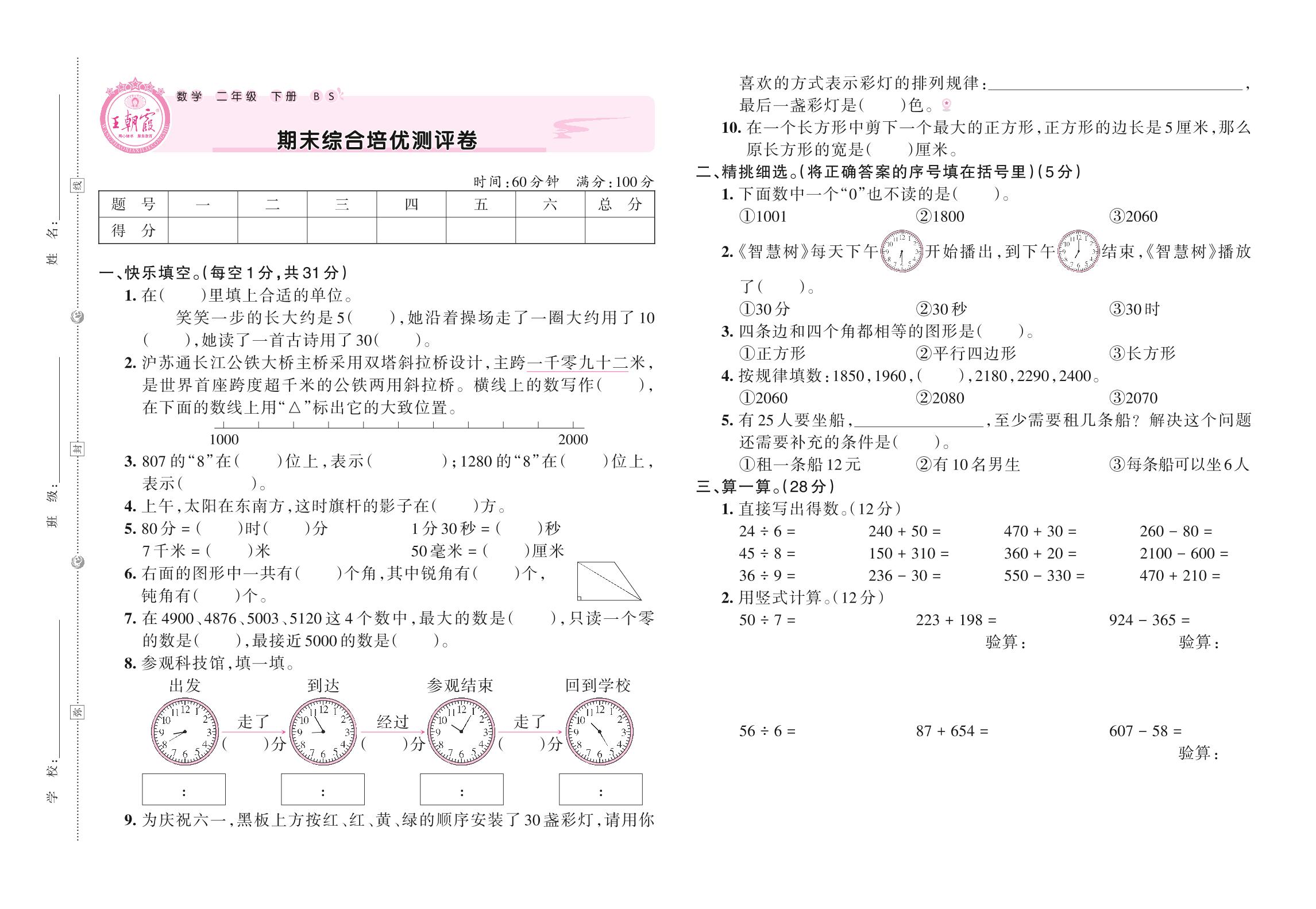 2021下册二年级数学北师版 期末综合培优测评卷