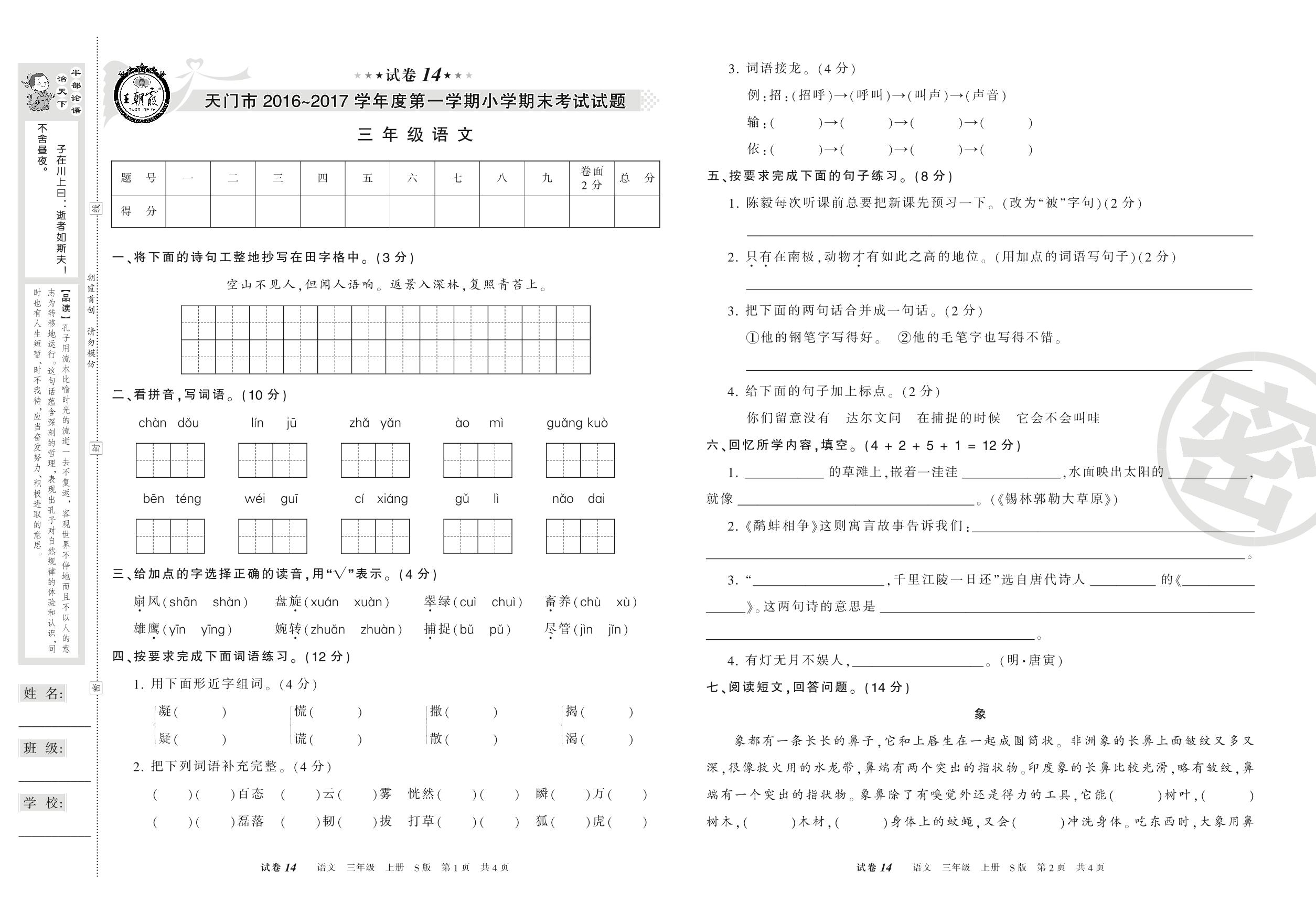 2016-2017学年第一学期天门市三年级语文试卷(S版)【14】