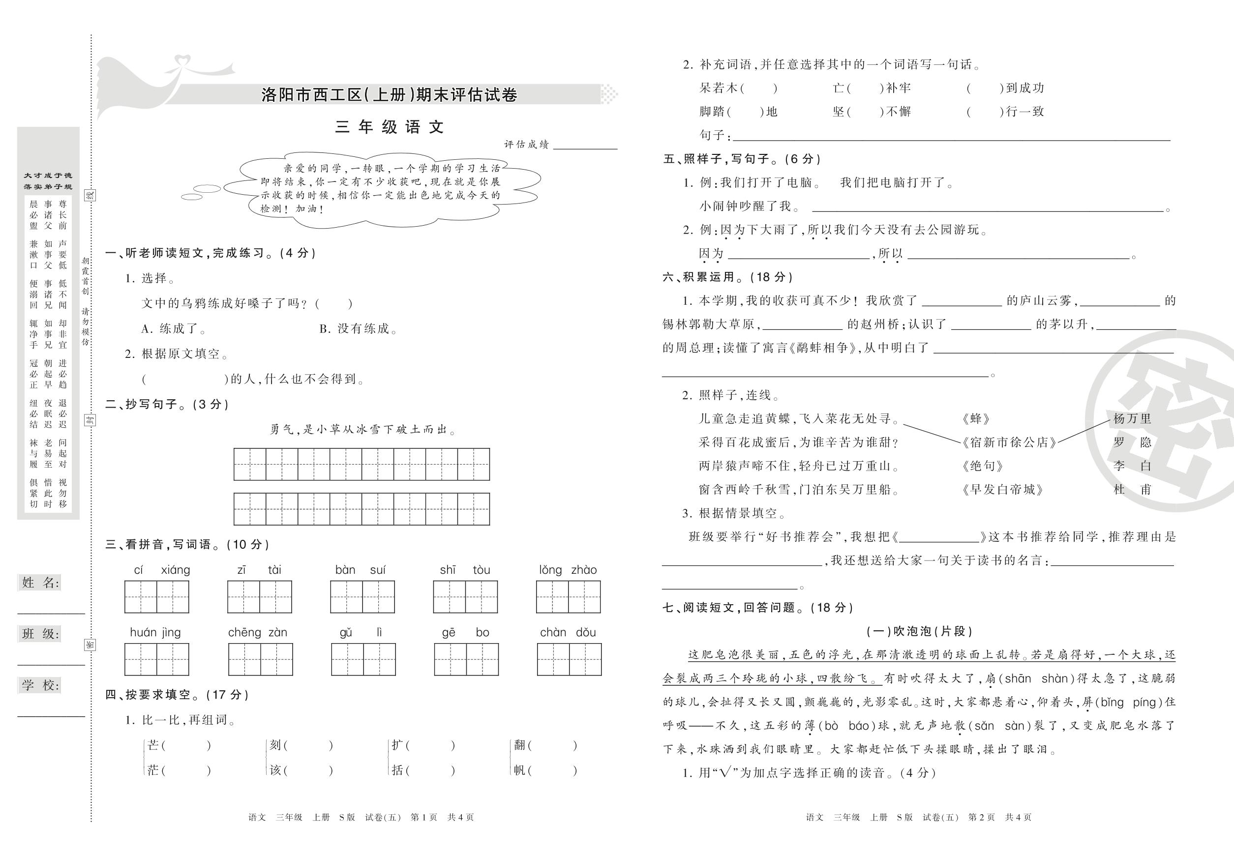 三年级语文S版上册期末卷