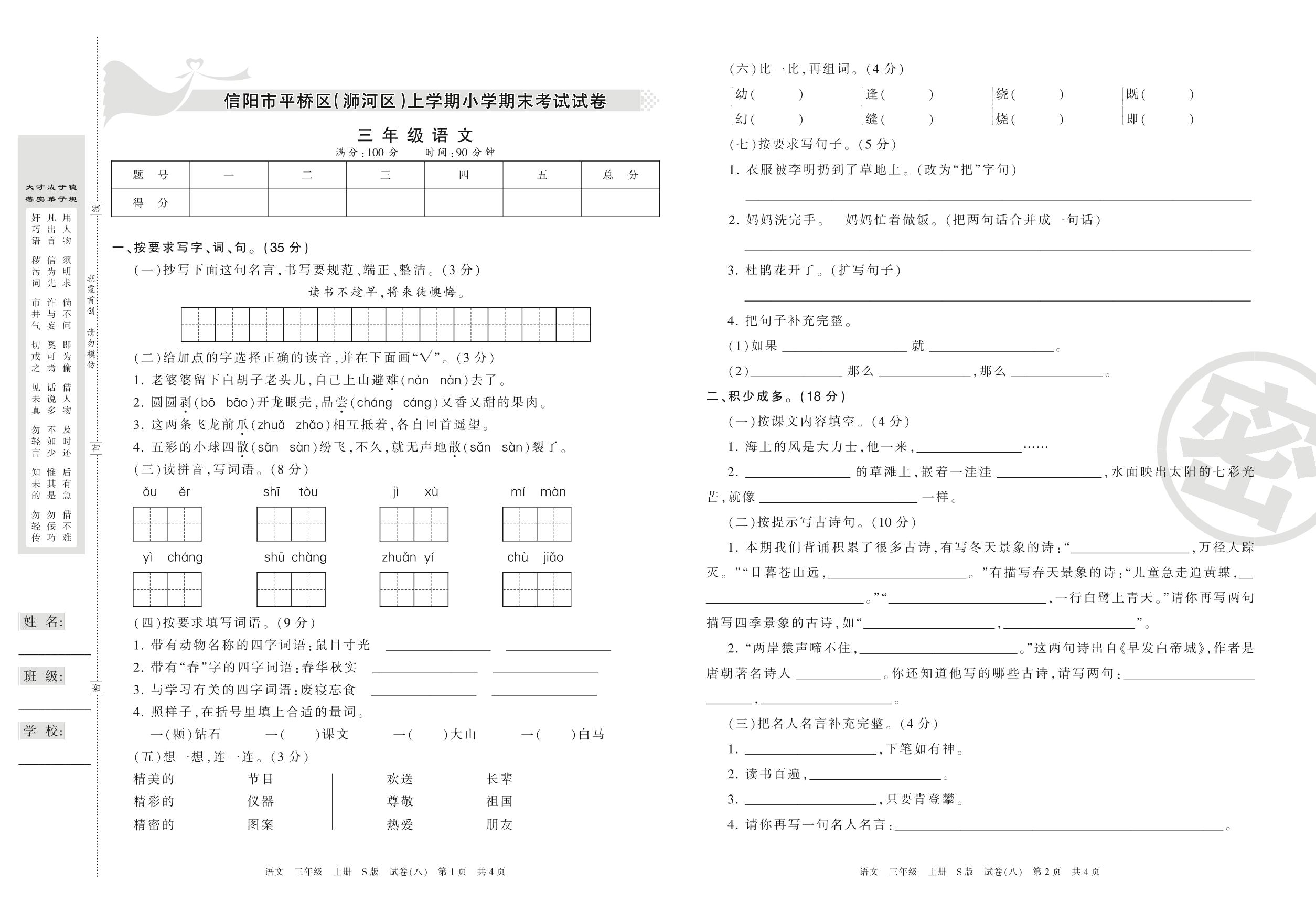 2016-2017学年第一学期信阳市平桥区(浉河区)三年级语文试卷(S版)【8】