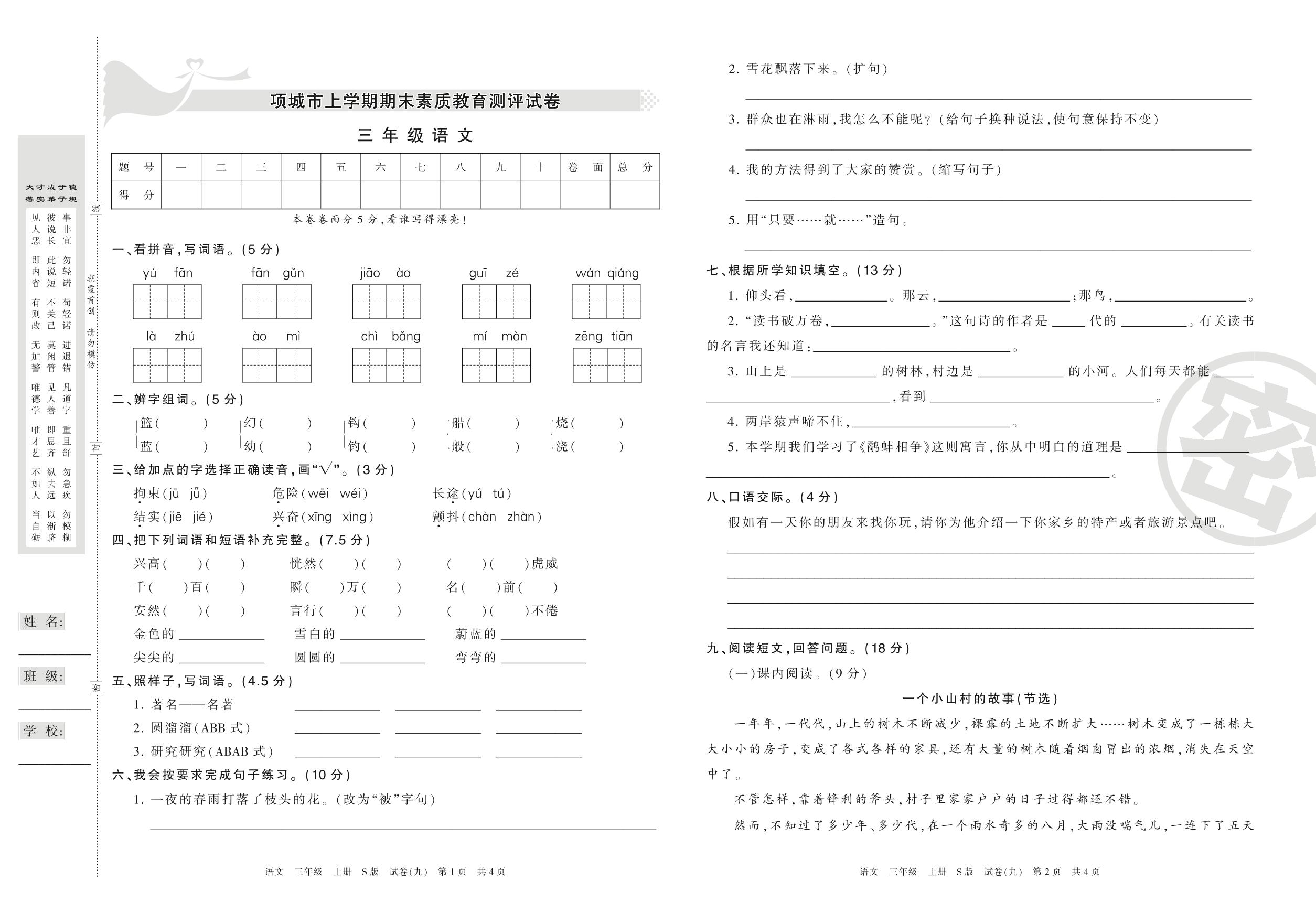 2016-2017学年第一学期项城市三年级语文试卷(S版)【9】