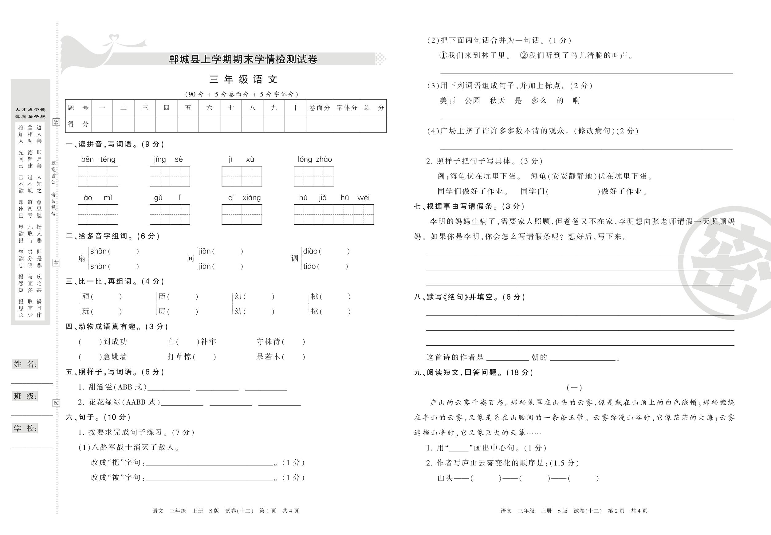 2016-2017学年第一学期周口市郸城县三年级语文试卷(S版)【12】