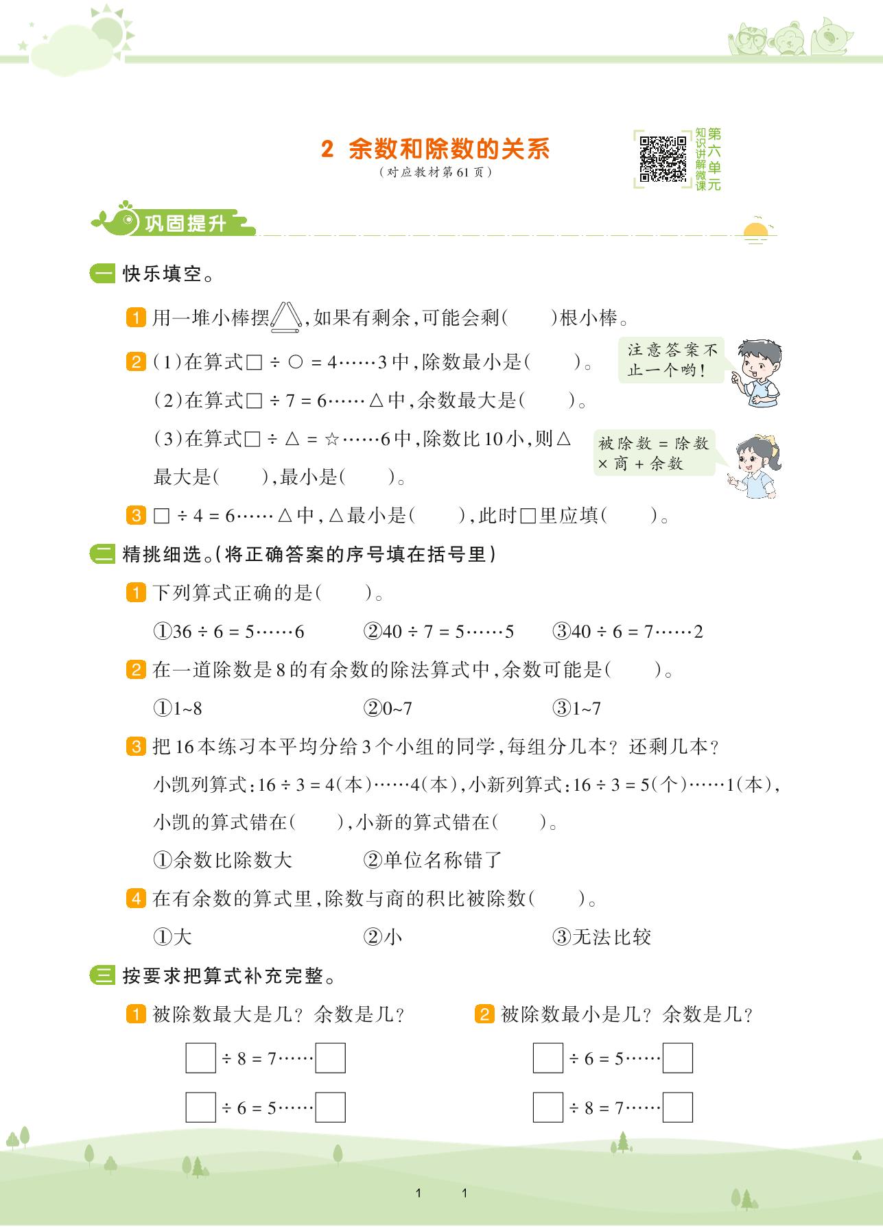 2021下册二年级数学人教版 第六单元 有余数的除法——2 余数和除数的关系