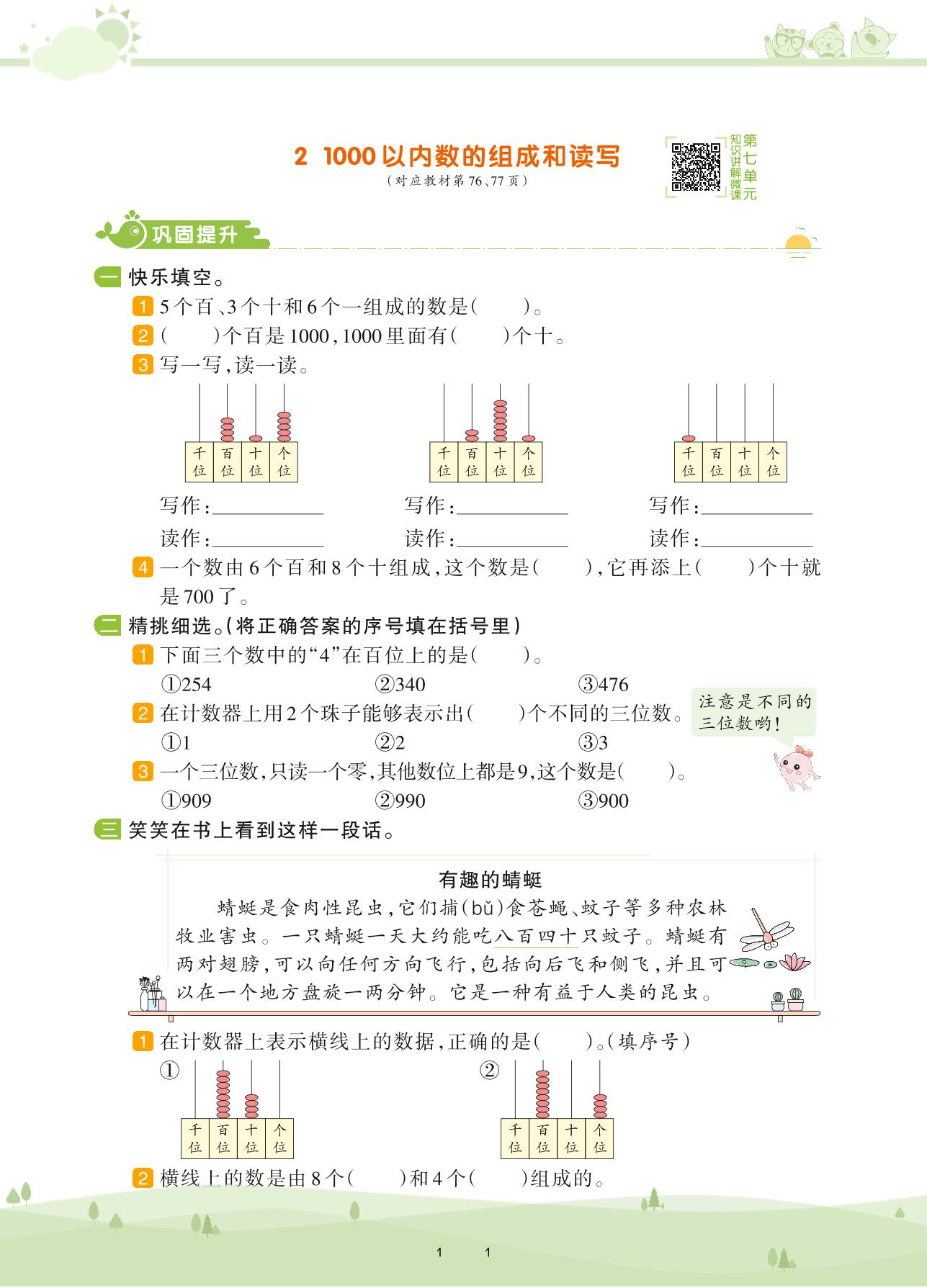 2021下册二年级数学人教版 第七单元 万以内数的认识——2 1000以内数的组成和读写