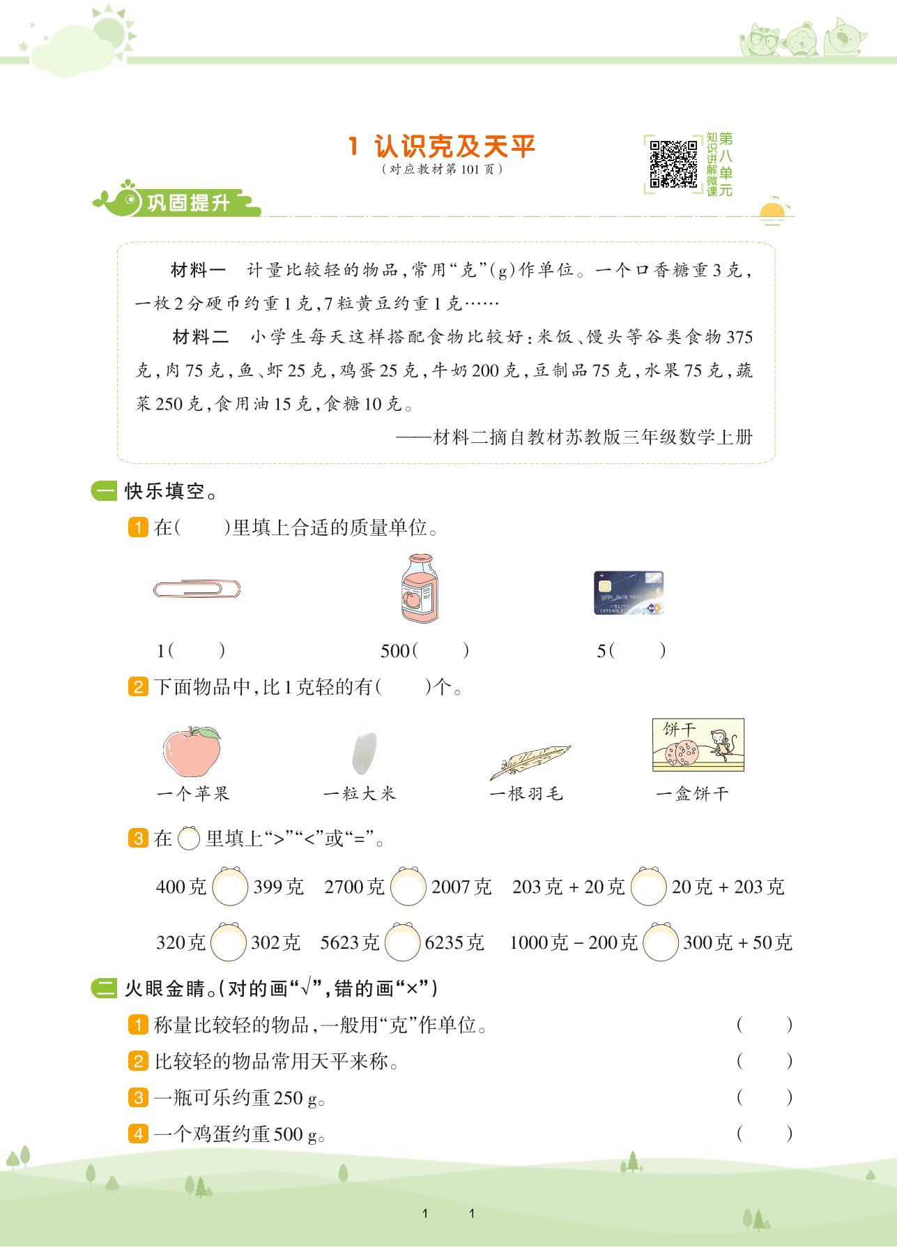2021下册二年级数学人教版 第八单元 克和千克——1 认识克及天平