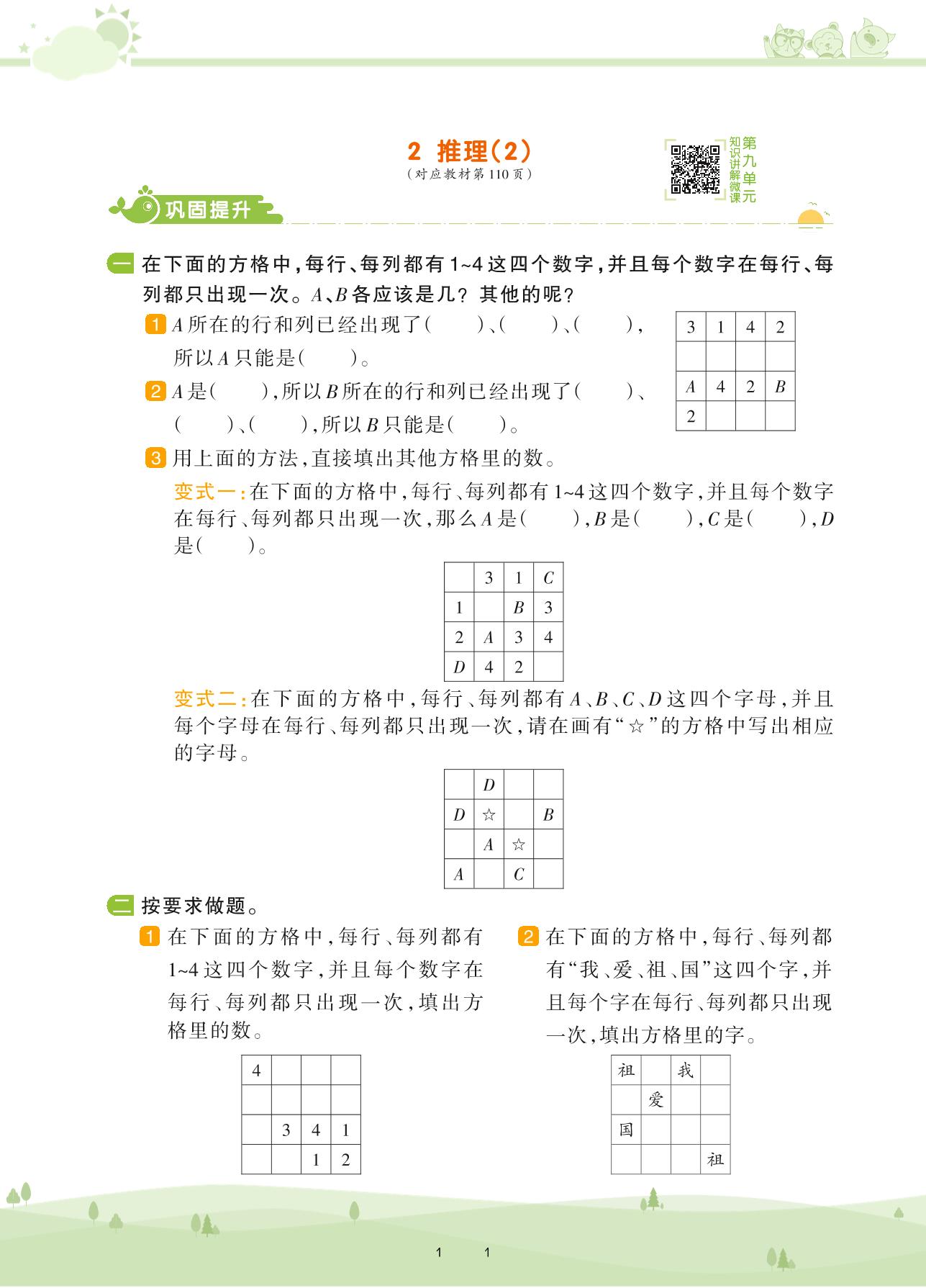 2021下册二年级数学人教版 第九单元 数学广角——推理——2 推理(2)