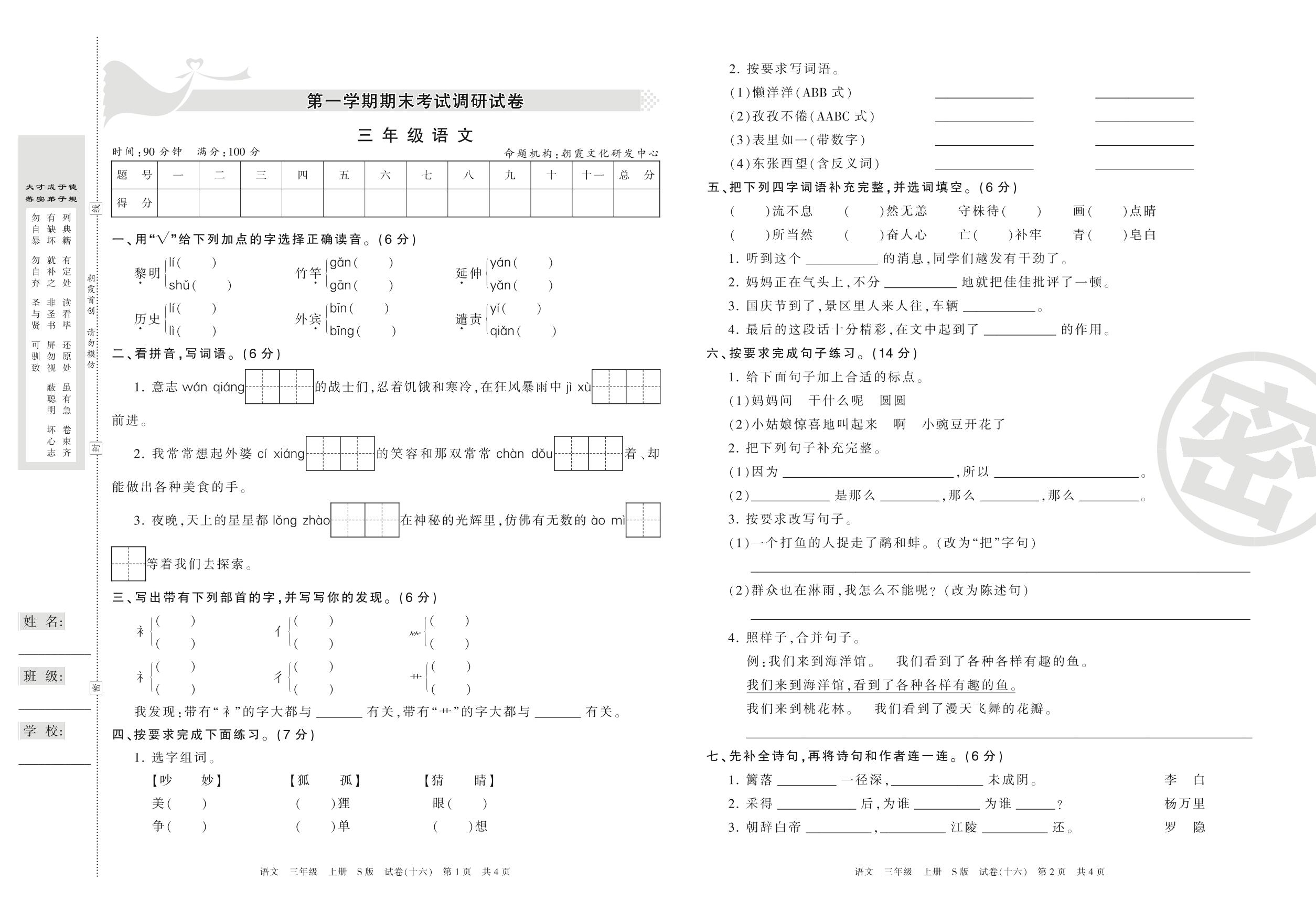王朝霞期末调研卷三年级上册语文(S版)【16】