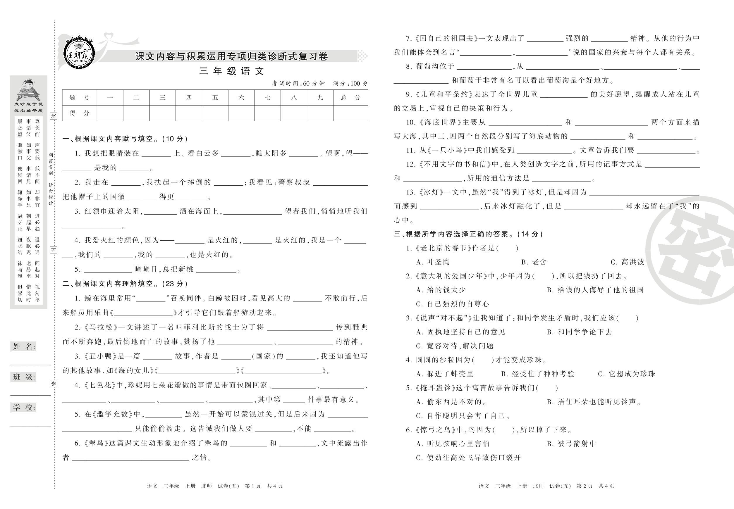 王朝霞期末专项卷三年级上册语文(北师版)【5】