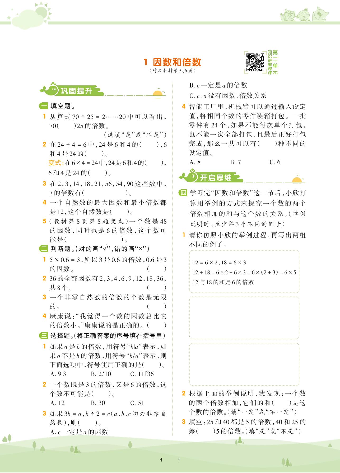 2021下册五年级数学人教版 第二单元 因数与倍数——1 因数和倍数