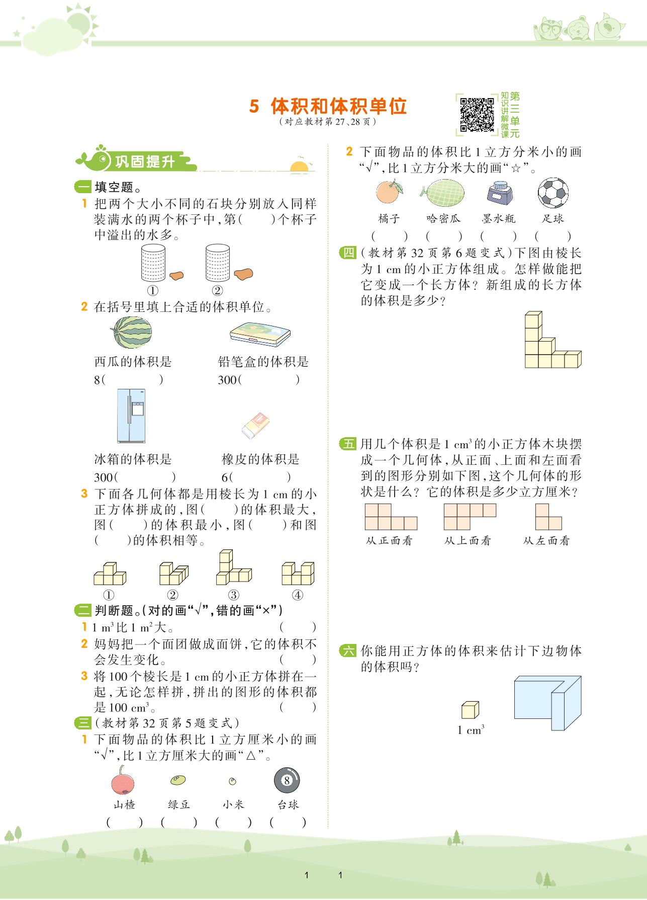 2021下册五年级数学人教版 第三单元 长方体和正方体——5 体积和体积单位