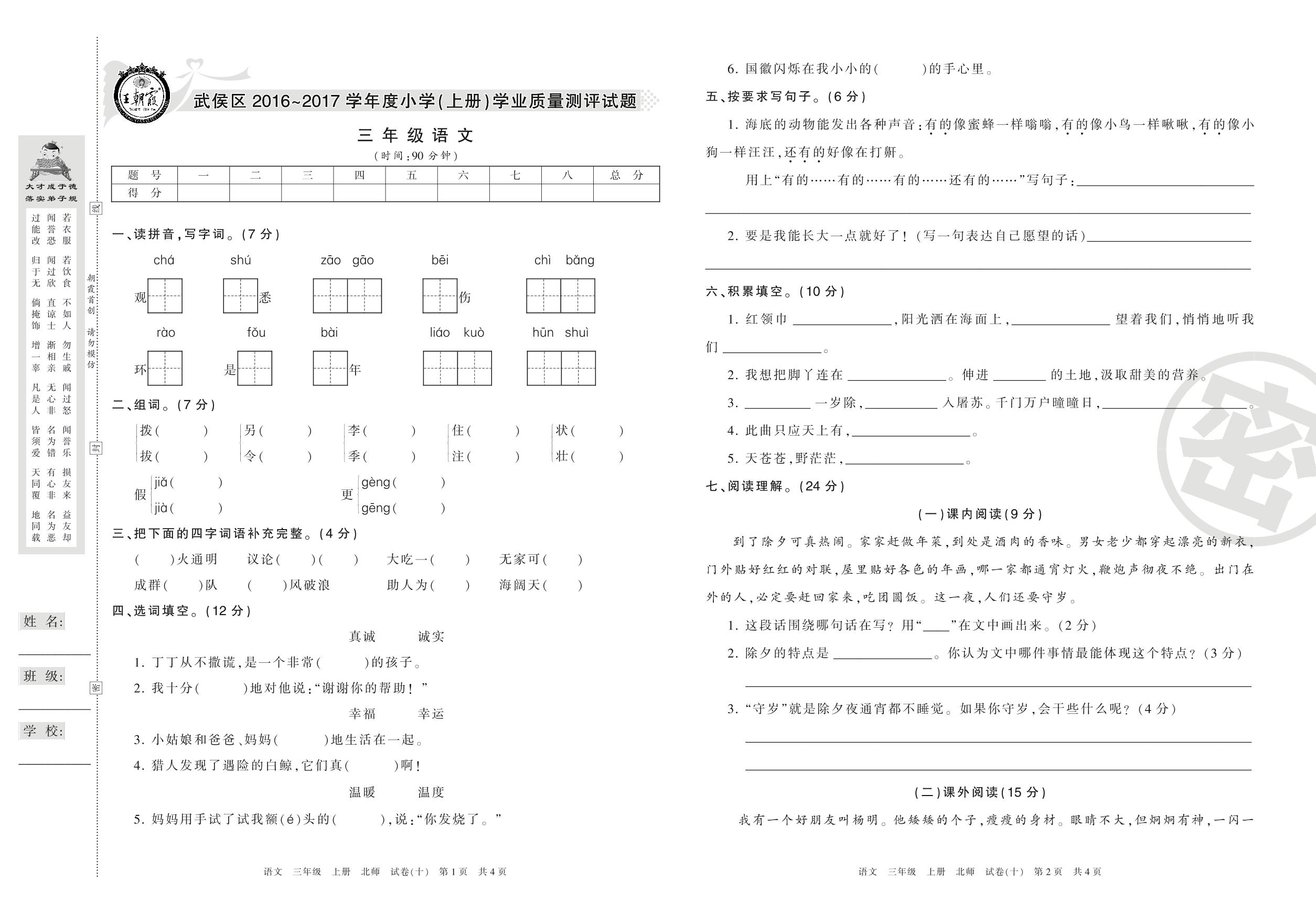 2016-2017学年第一学期成都市武侯区三年级语文试卷(北师版)【10】