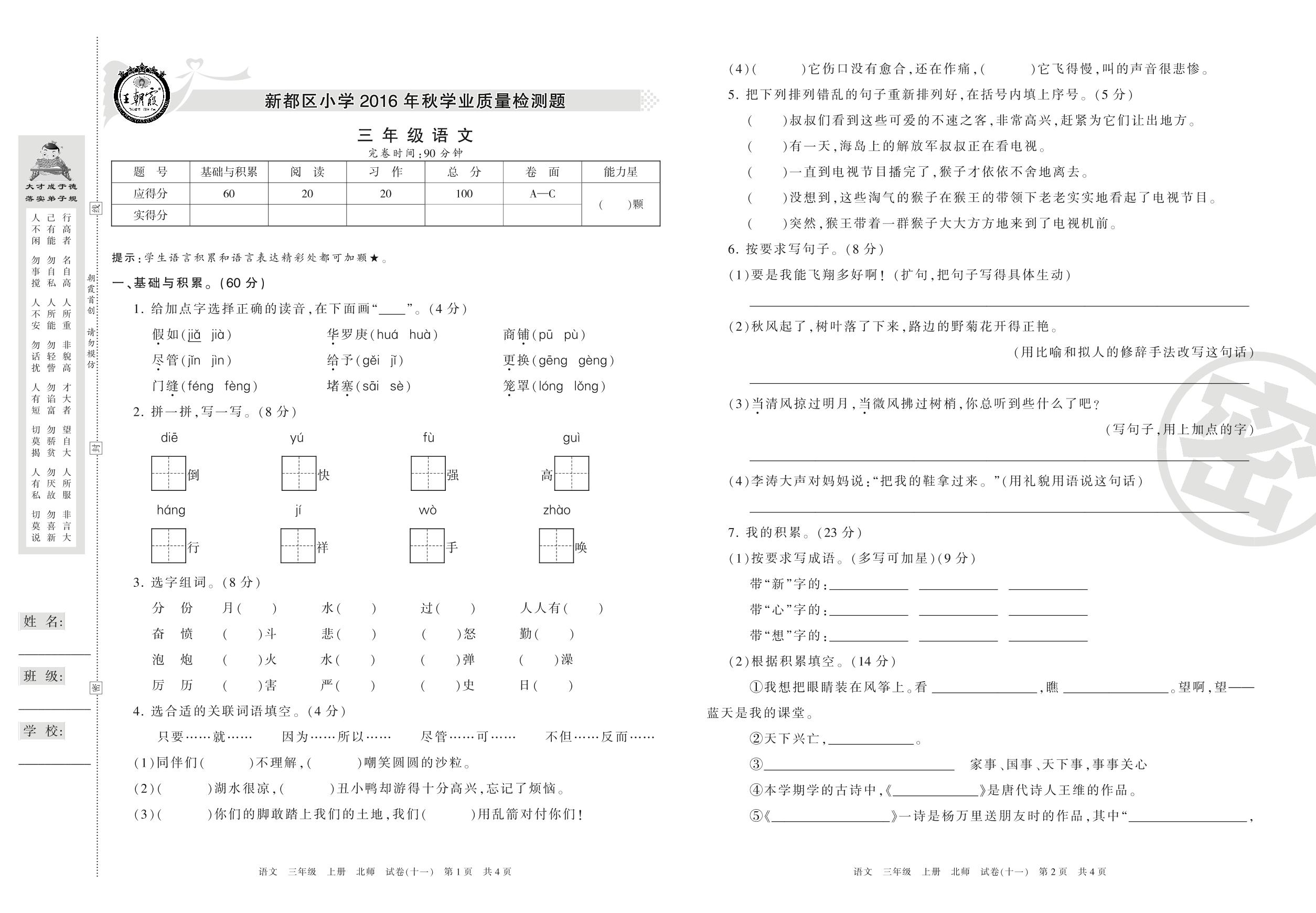 2016-2017学年第一学期成都市新都区三年级语文试卷(北师版)【11】