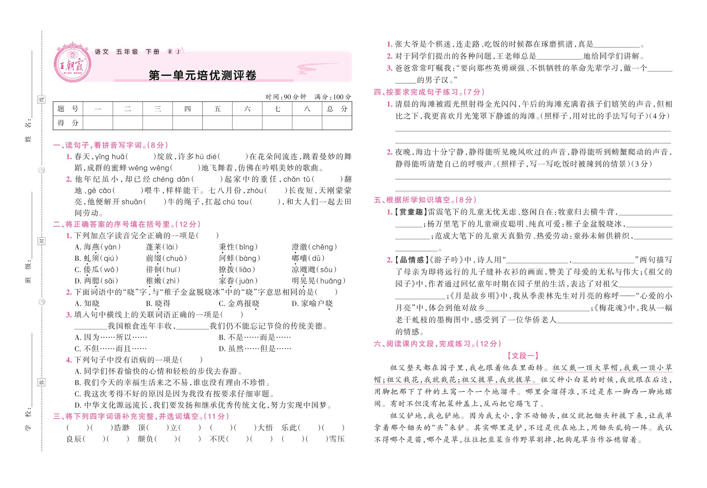 五年级语文人教版下册单元卷