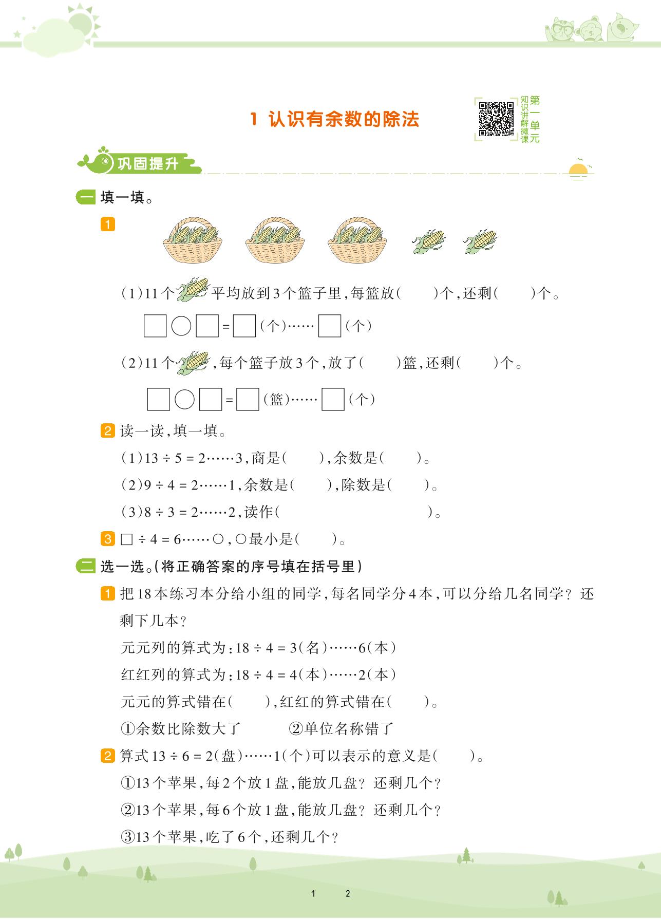 2021下册二年级数学苏教版 第一单元 有余数的除法——1 认识有余数的除法