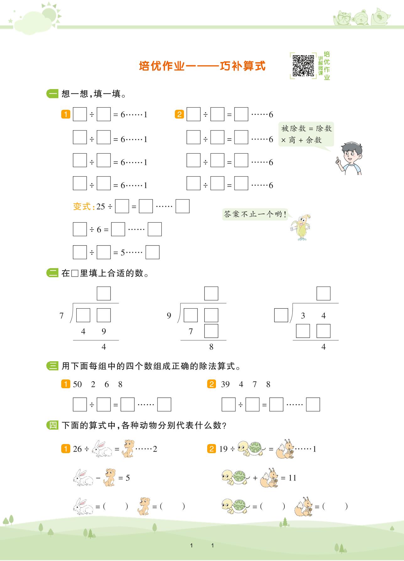 2021下册二年级数学苏教版 第一单元 有余数的除法——培优作业一 巧补算式
