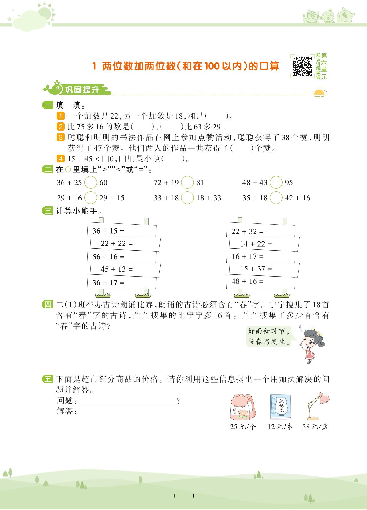2021下册二年级数学苏教版 第六单元 两、三位数的加法和减法——1 两位数加两位数(和在100以内)的口算