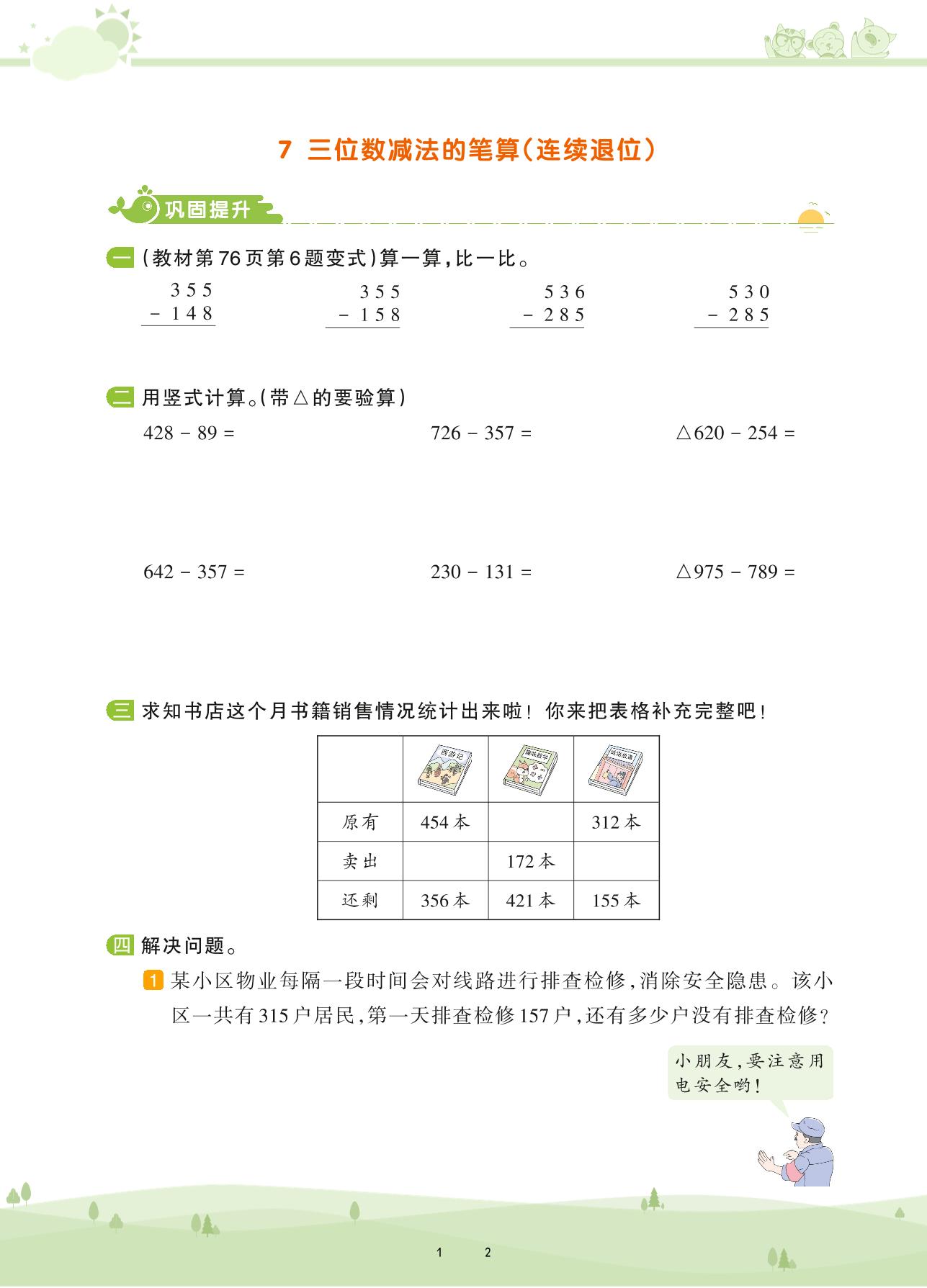 2021下册二年级数学苏教版 第六单元 两、三位数的加法和减法——7 三位数减法的笔算(连续退位)