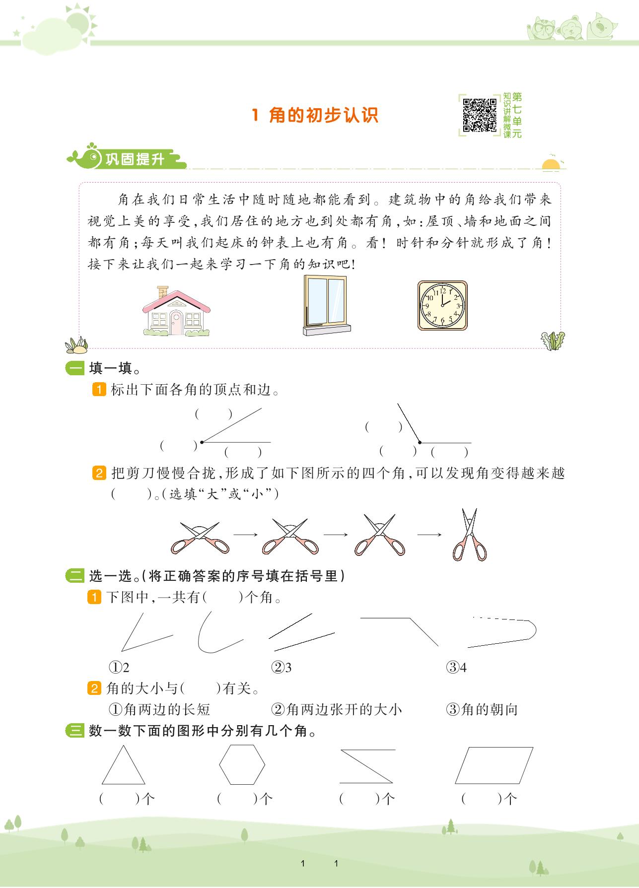 2021下册二年级数学苏教版 第七单元 角的初步认识——1 角的初步认识