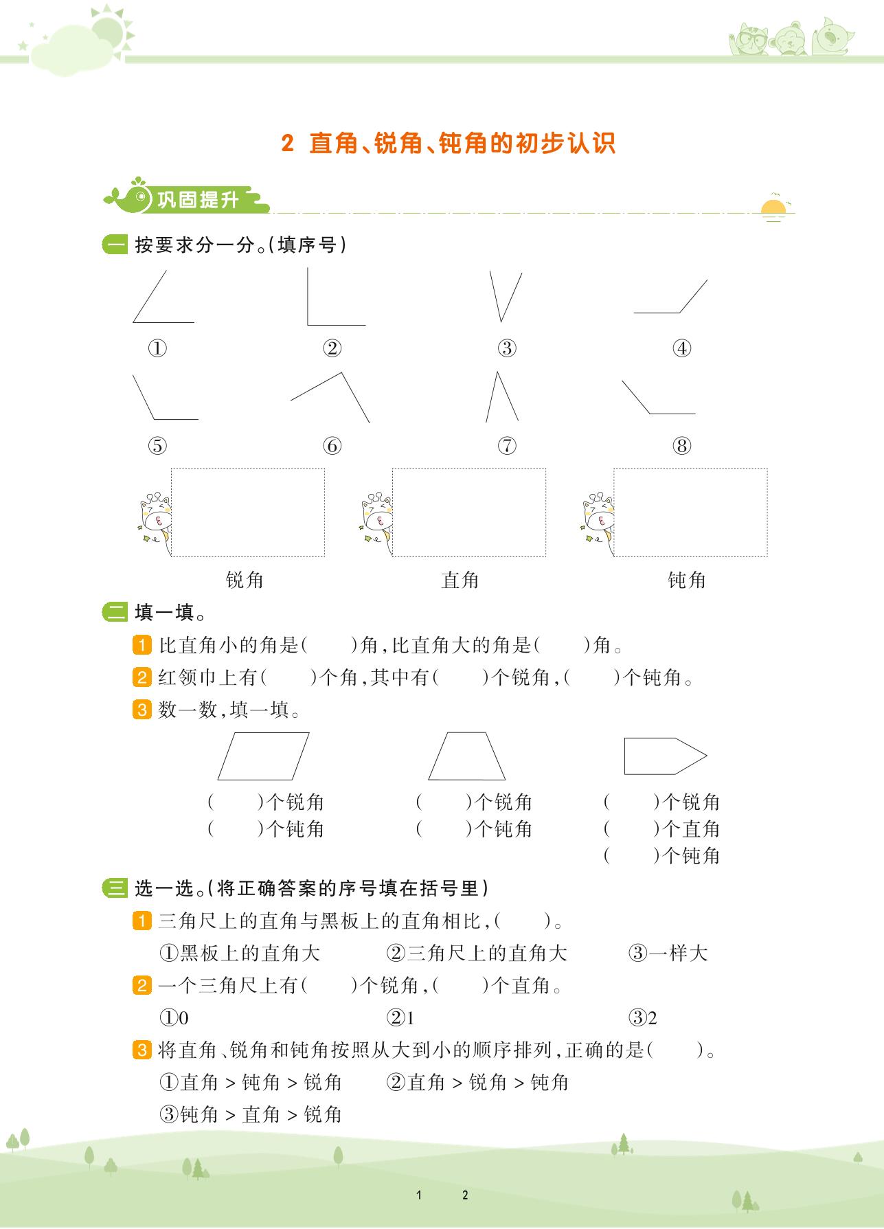 2021下册二年级数学苏教版 第七单元 角的初步认识——2 直角、锐角、钝角的初步认识