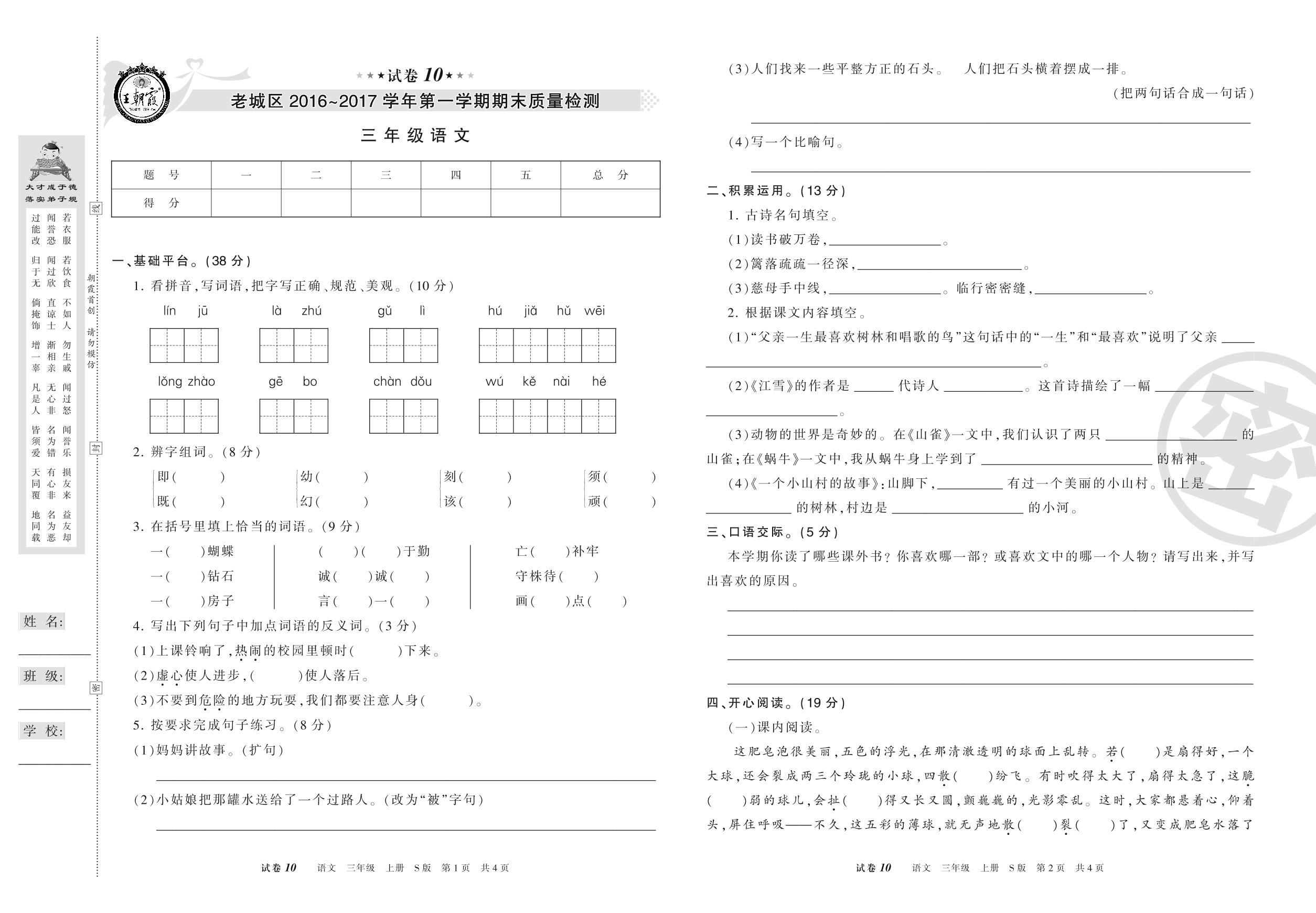 2016-2017学年第一学期洛阳市老城区三年级语文试卷(S版)【10】