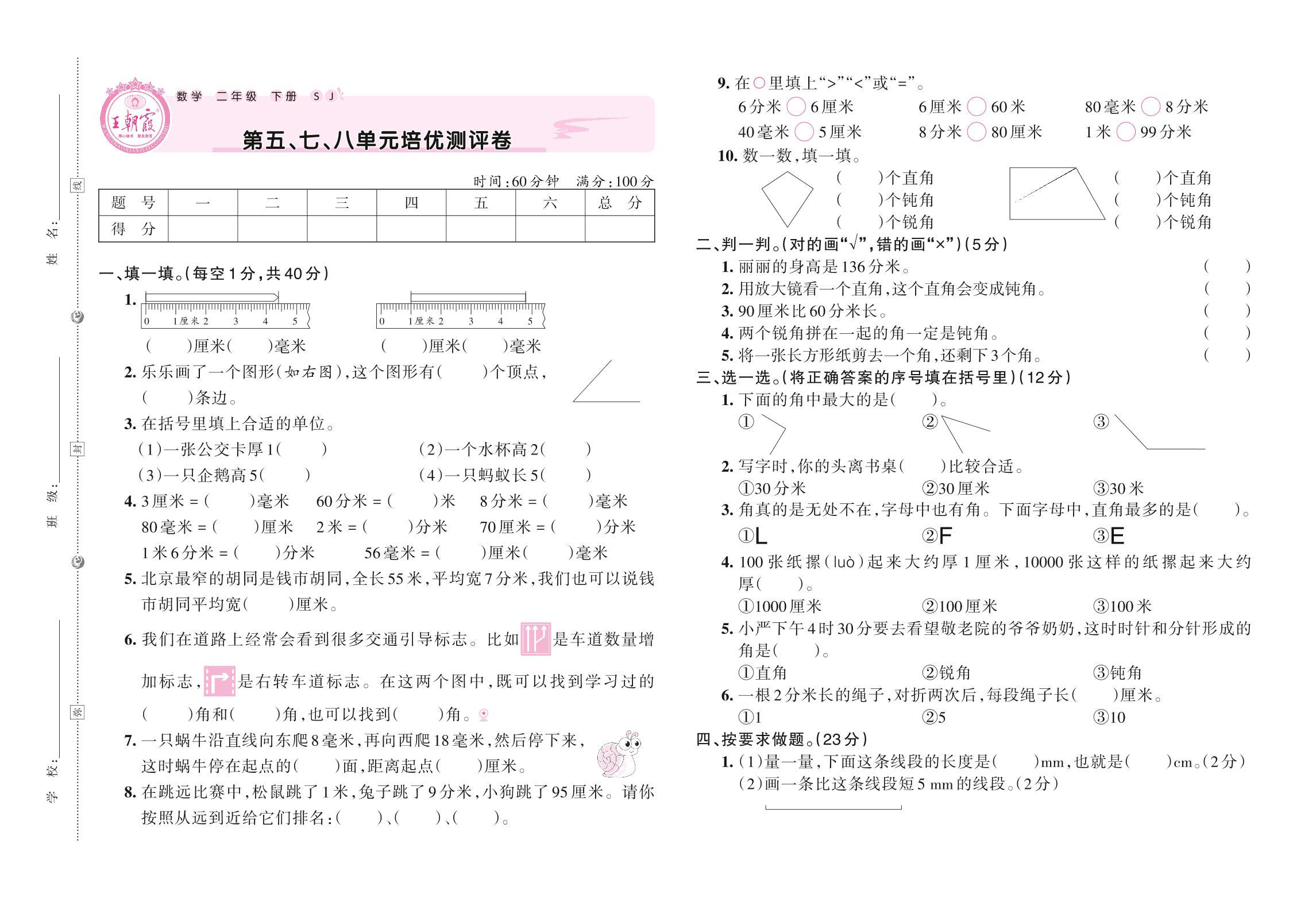 2021下册二年级数学苏教版 第五、七、八单元培优测评卷