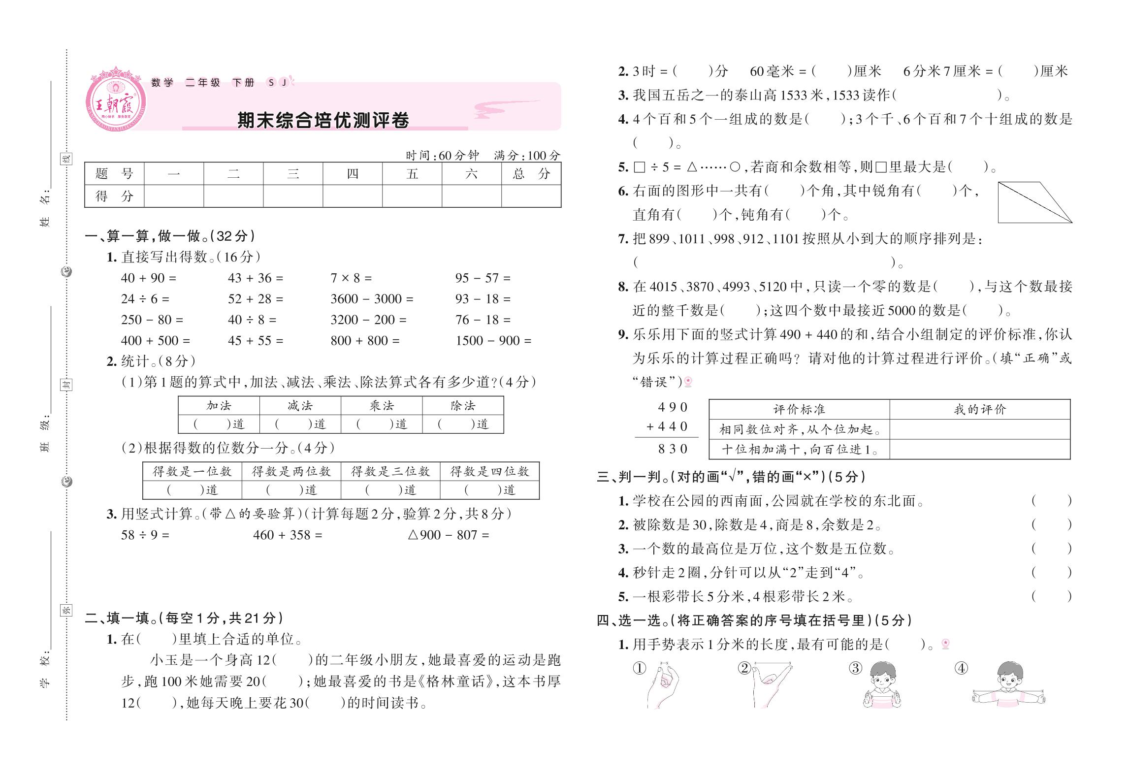 2021下册二年级数学苏教版 期末综合培优测评卷