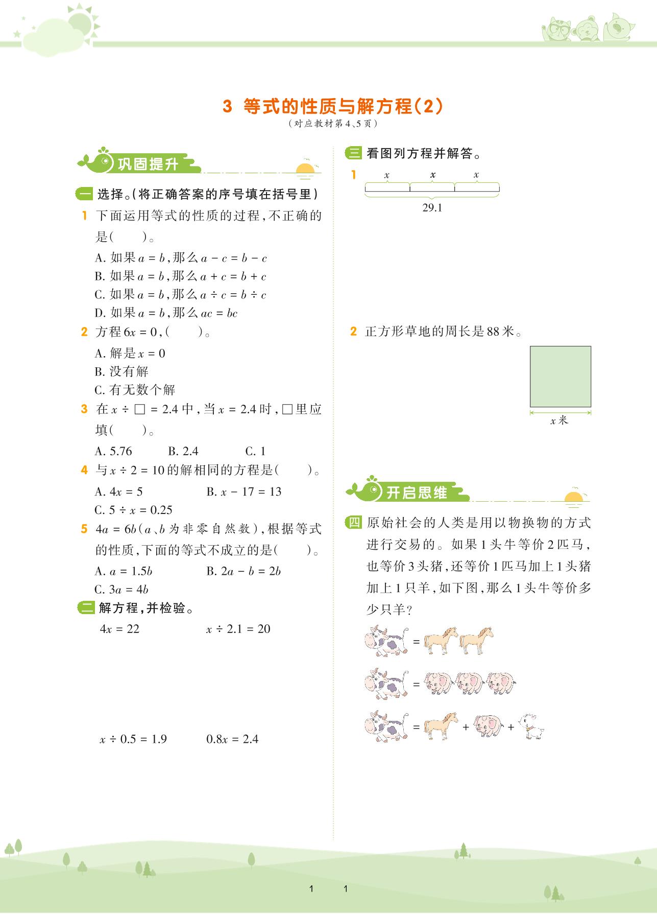 2021下册五年级数学苏教版 第一单元 简易方程——3 等式的性质与解方程(2)