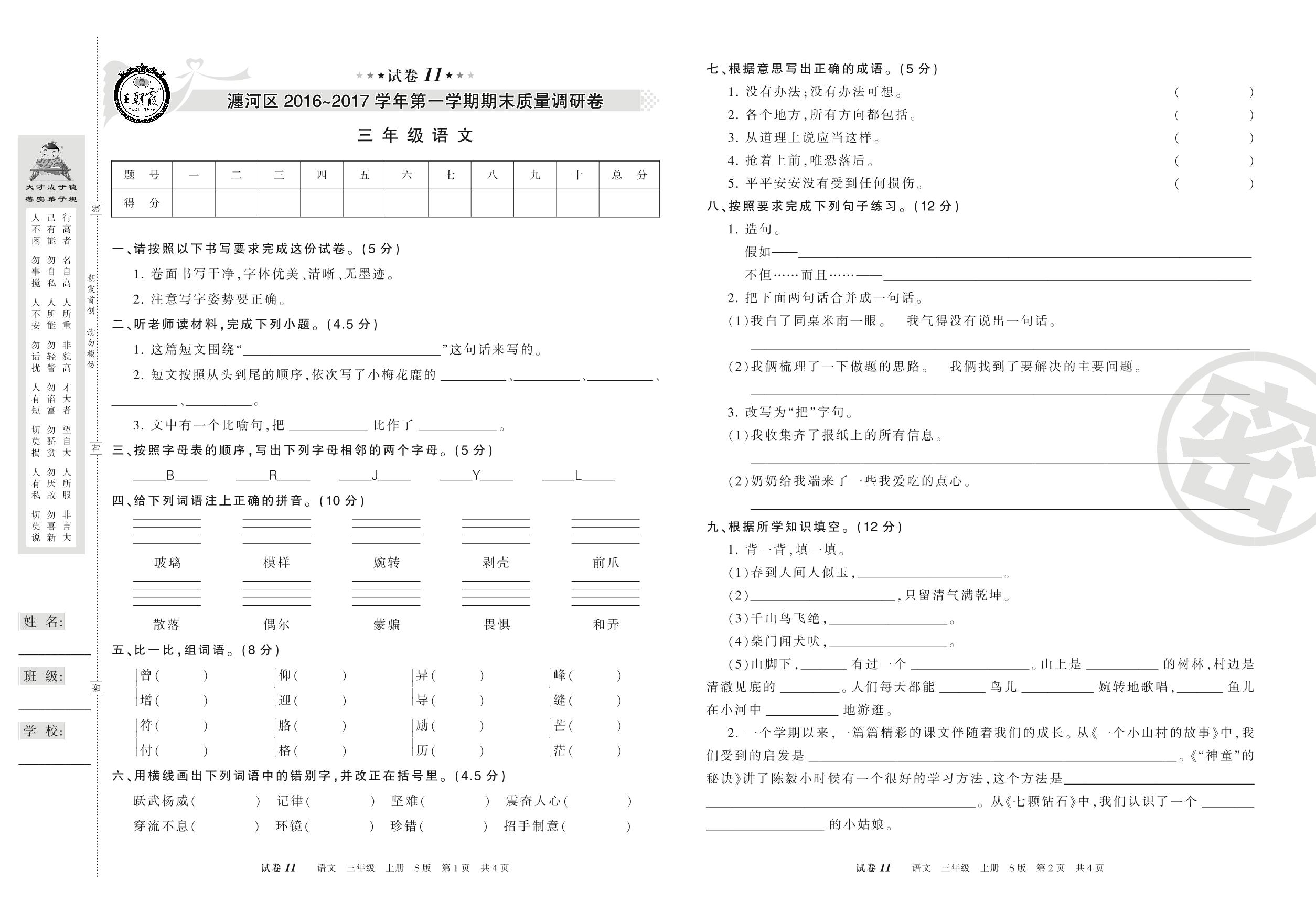 2016-2017学年第一学期洛阳市瀍河区三年级语文试卷(S版)【11】