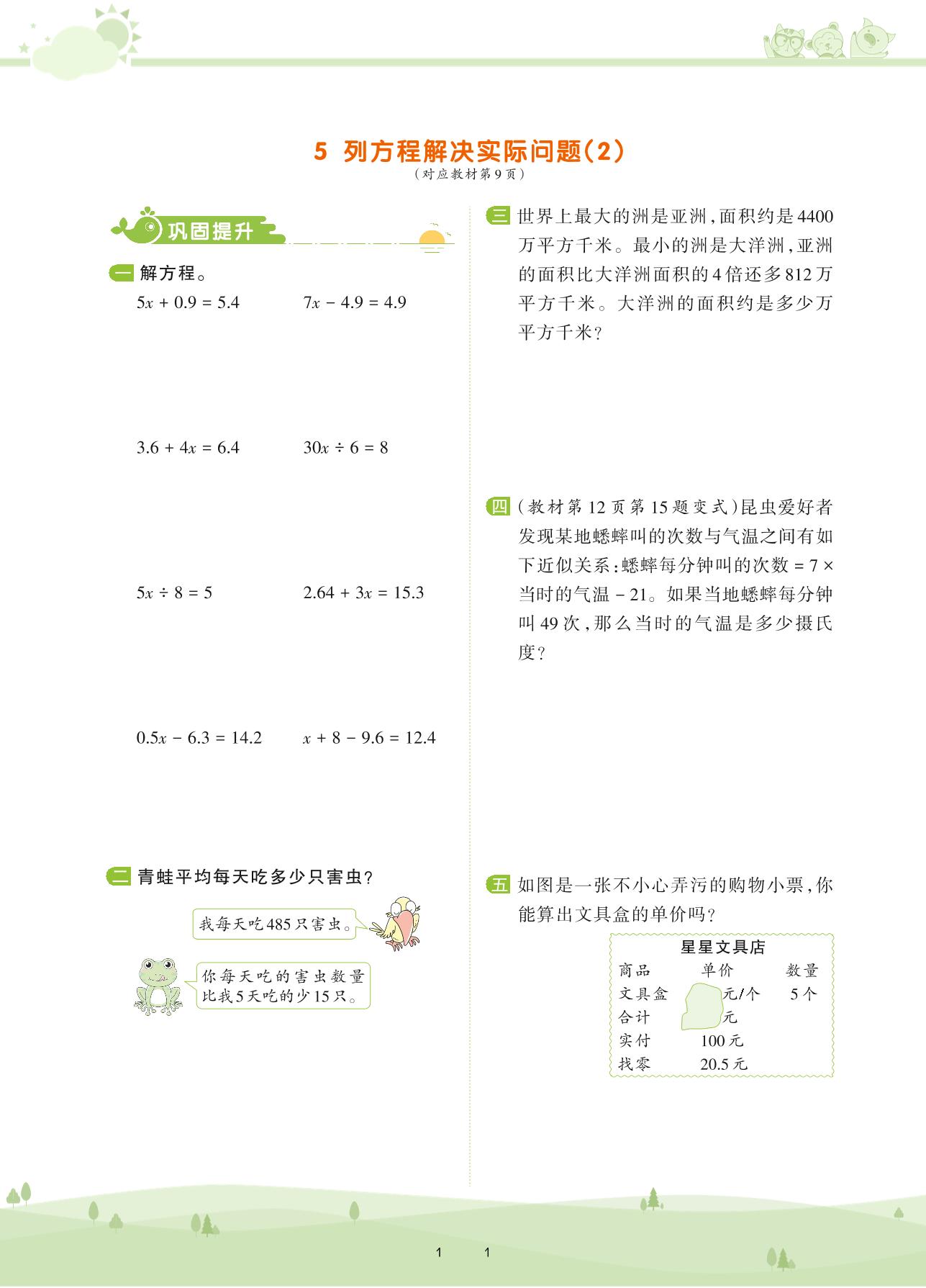 2021下册五年级数学苏教版 第一单元 简易方程——5 列方程解决实际问题(2)