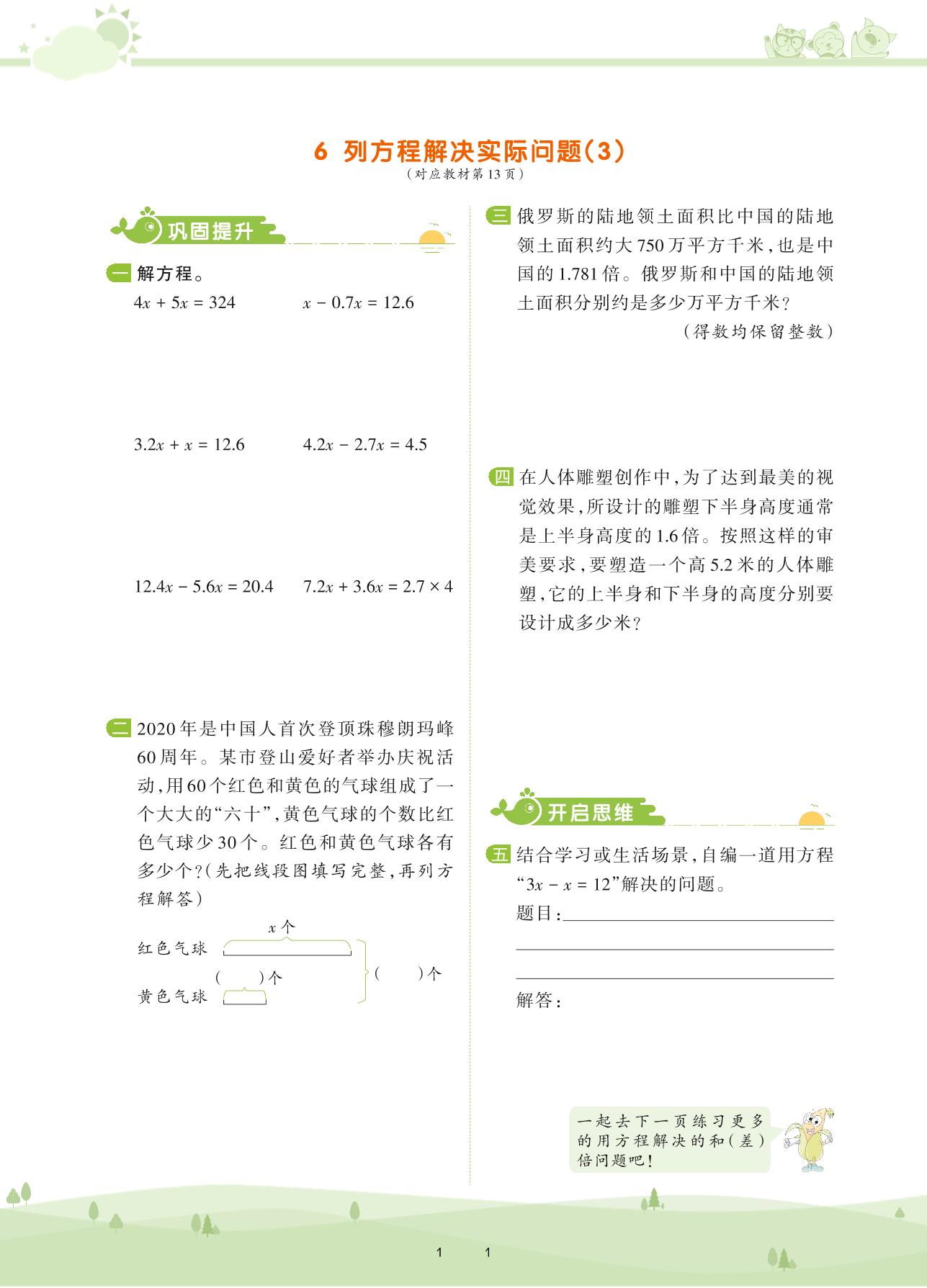 2021下册五年级数学苏教版 第一单元 简易方程——6 列方程解决实际问题(3)
