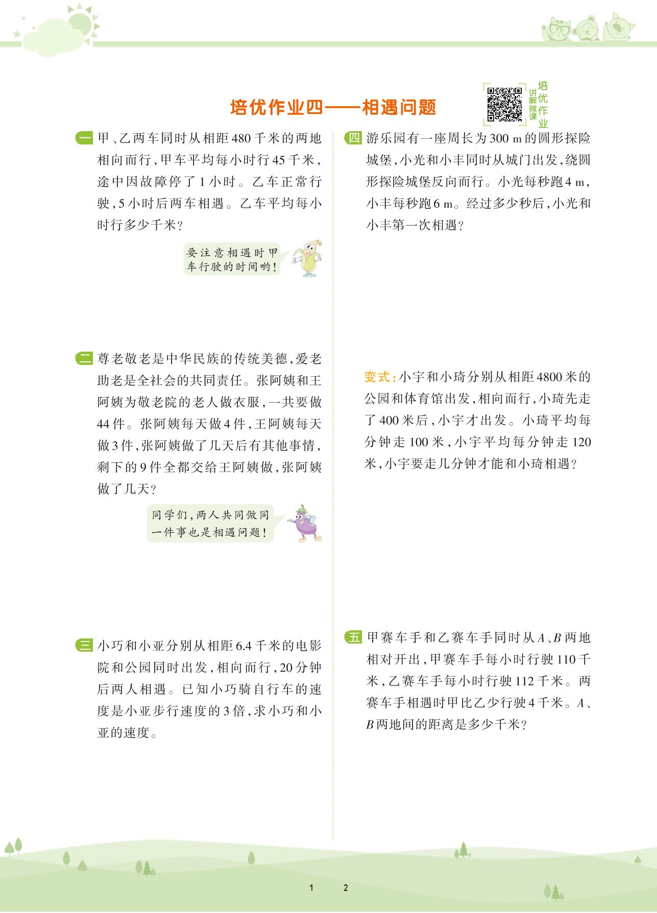 2021下册五年级数学苏教版 第一单元 简易方程——培优作业四 相遇问题