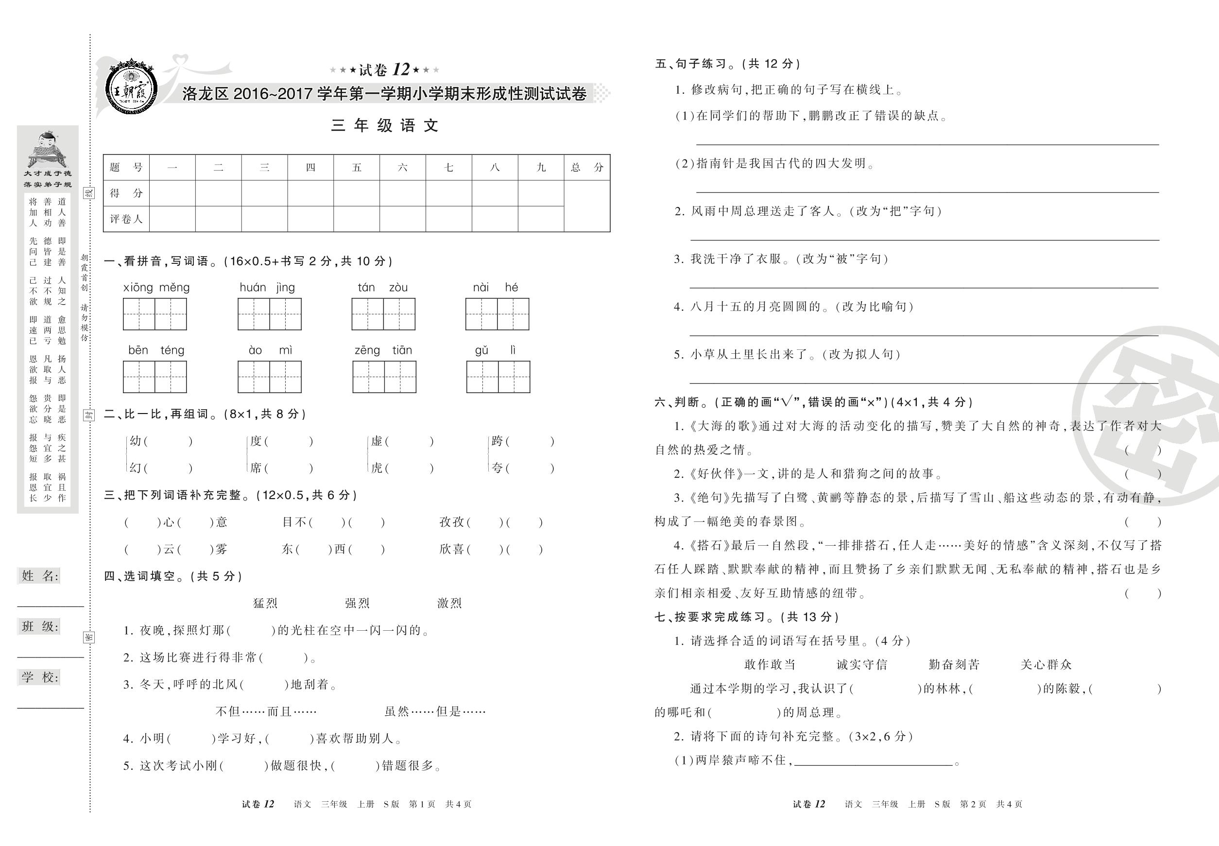 2016-2017学年第一学期洛阳市洛龙区三年级语文试卷(S版)【12】