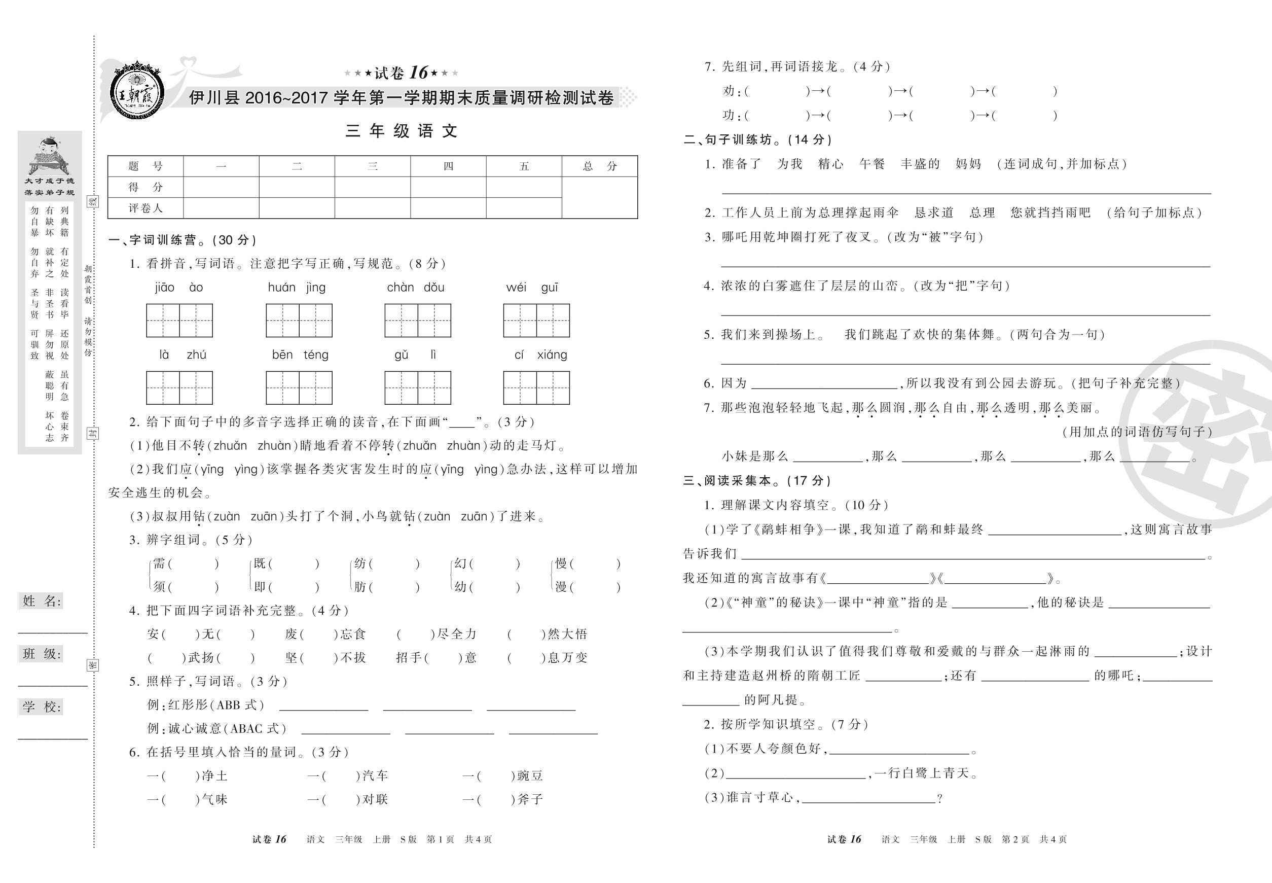 2016-2017学年第一学期洛阳市伊川县三年级语文试卷(S版)【16】