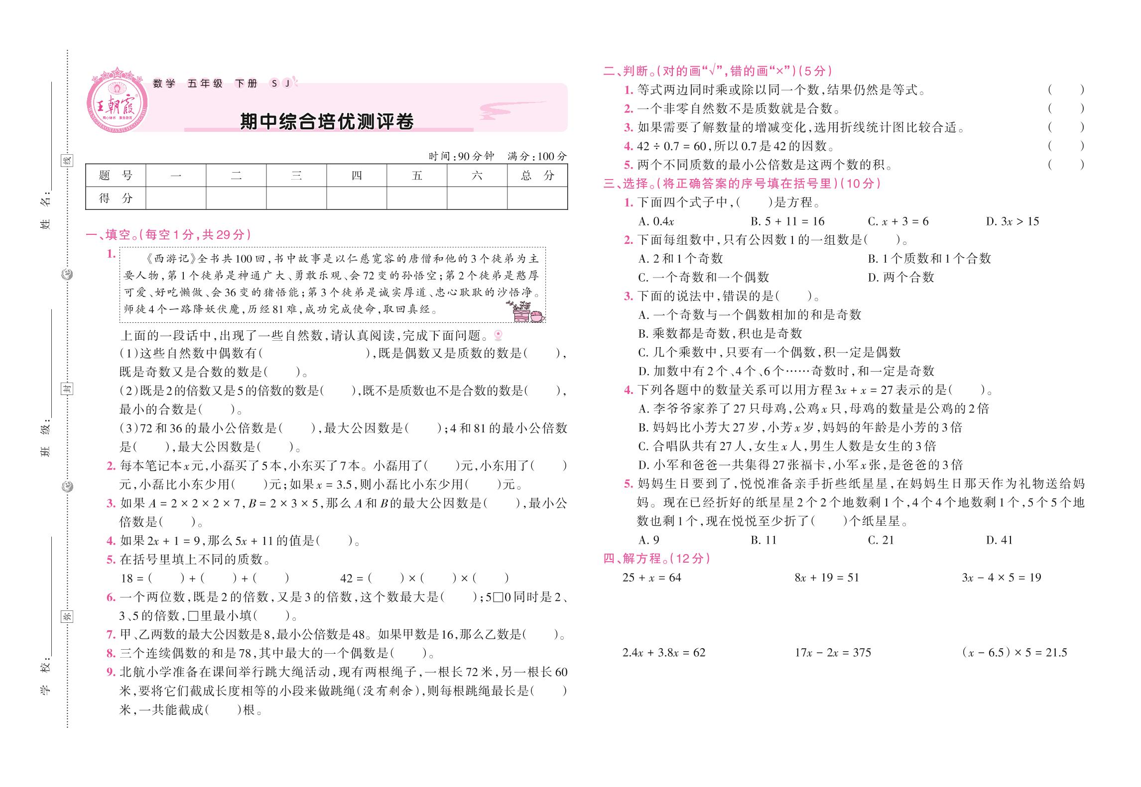 2021下册五年级数学苏教版 期中综合培优测评卷