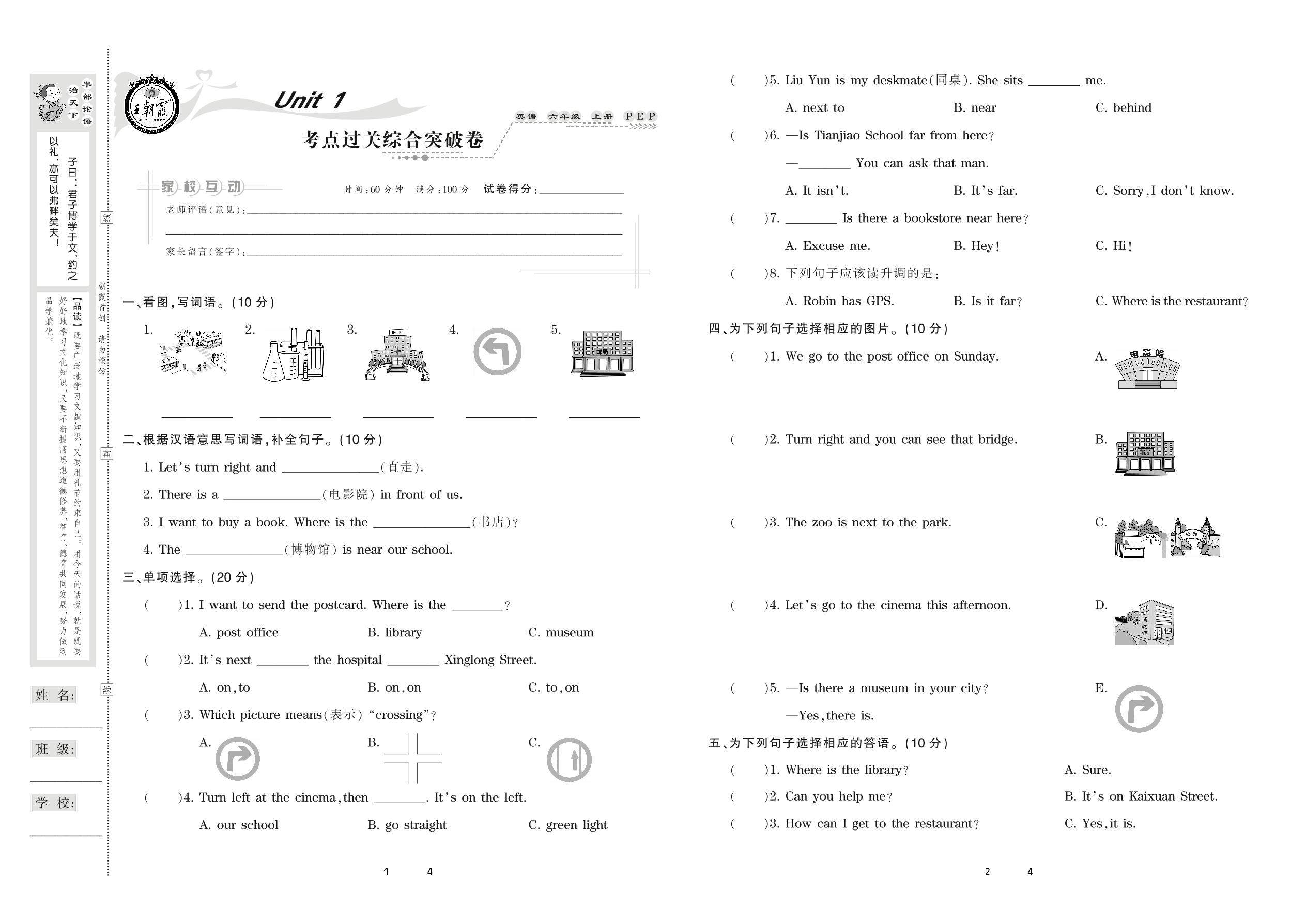 2020上册六年级英语PEP版 Unit 1 考点过关综合突破卷