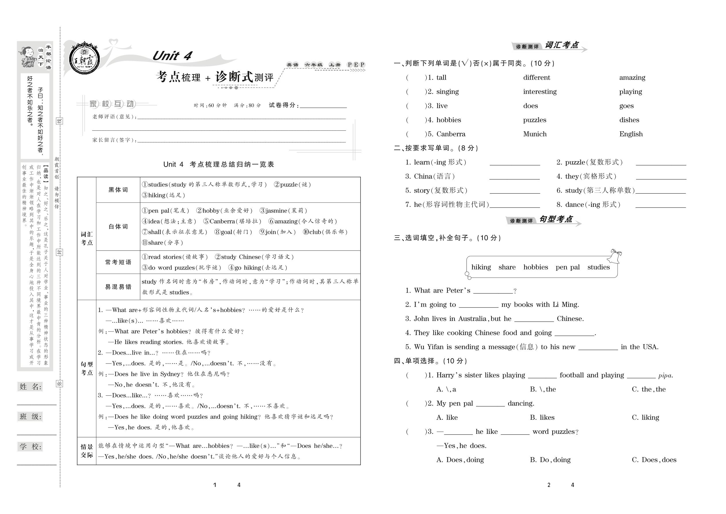 2020上册六年级英语PEP版 Unit 4 考点梳理+诊断式测评