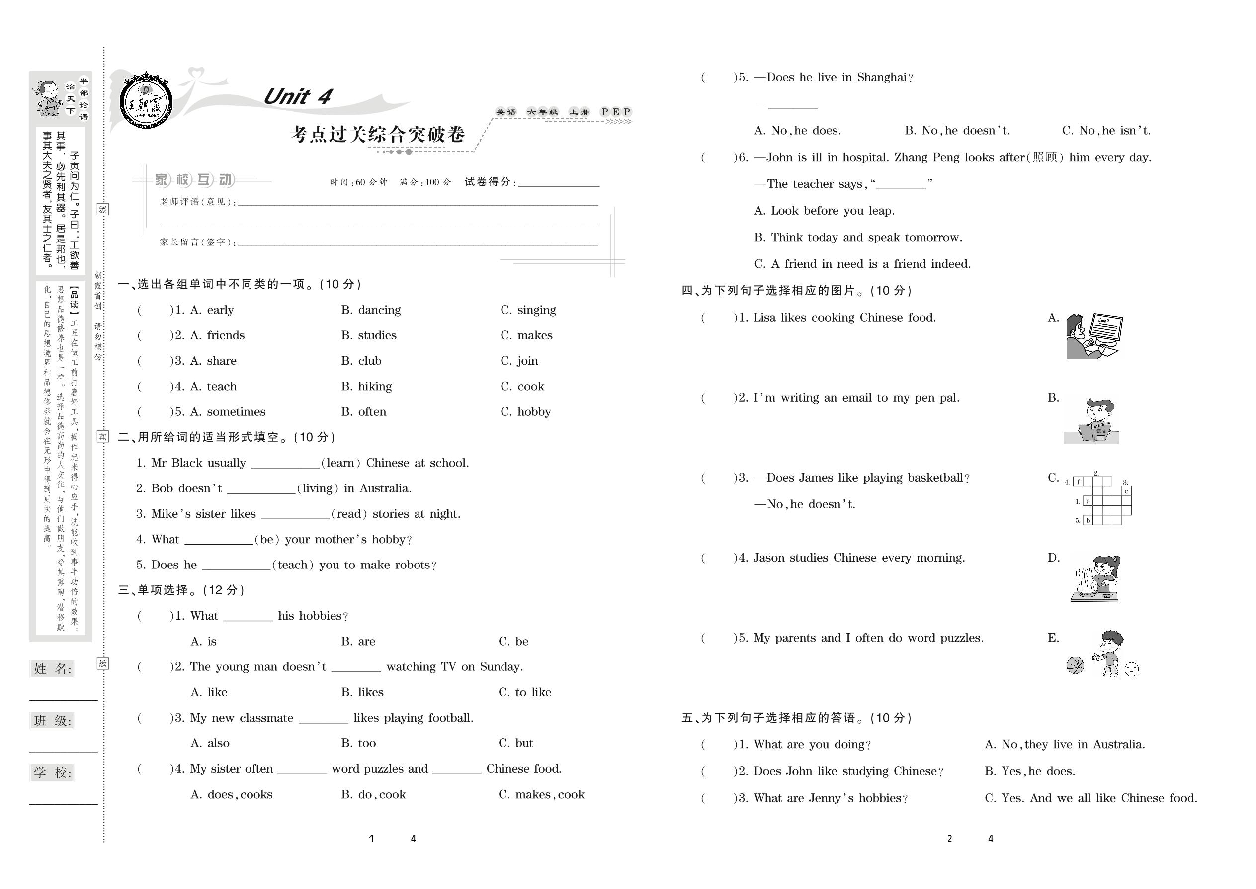 2020上册六年级英语PEP版 Unit 4 考点过关综合突破卷