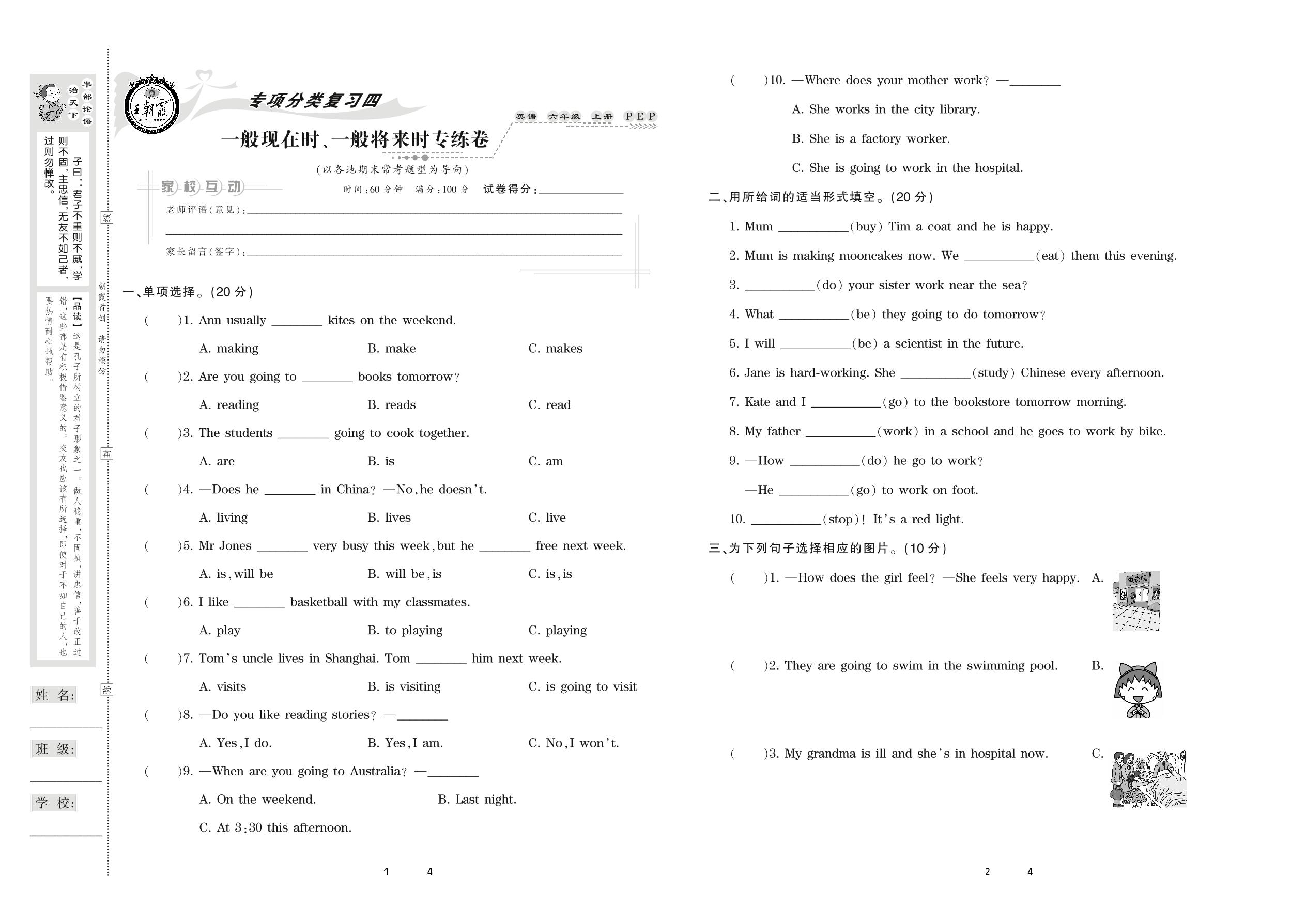 2020上册六年级英语PEP版 一般现在时、一般将来时专练卷