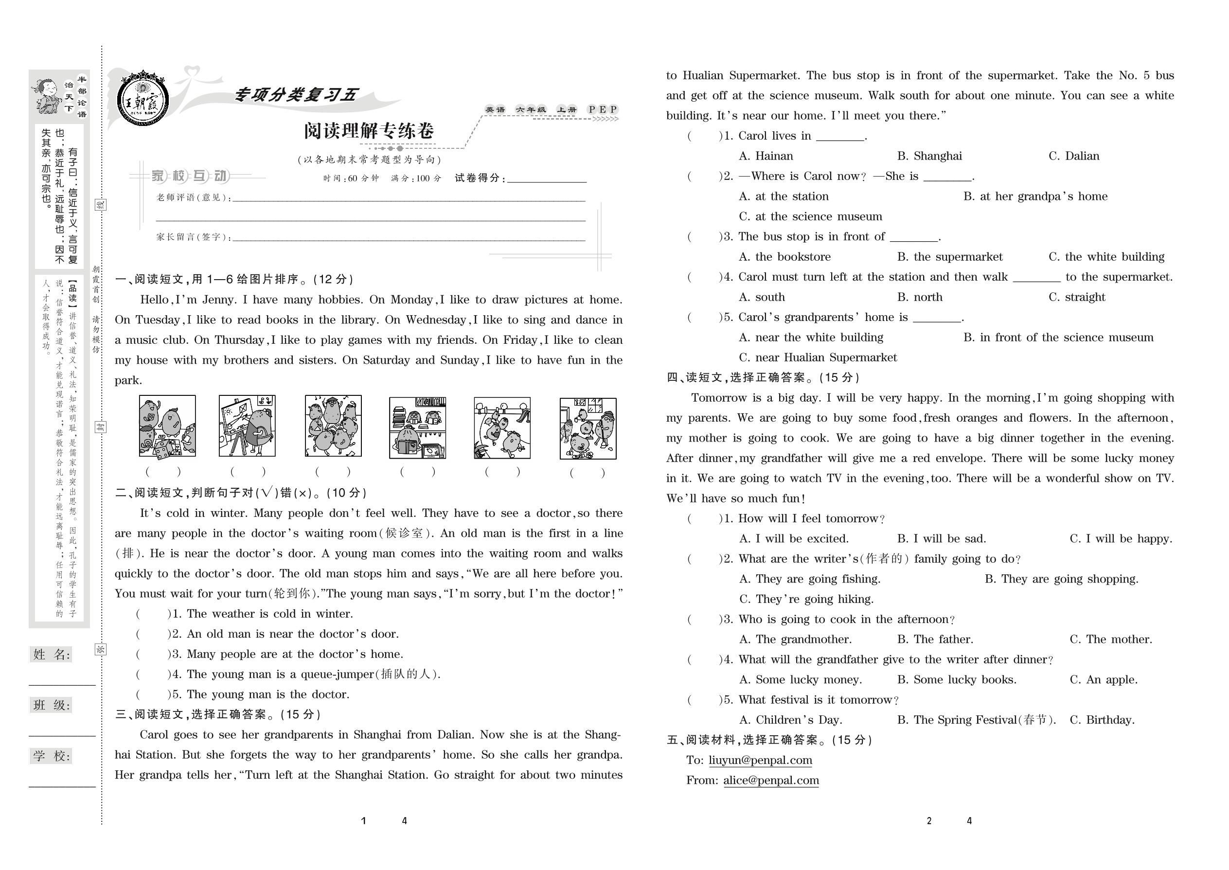 2020上册六年级英语PEP版 阅读理解专练卷