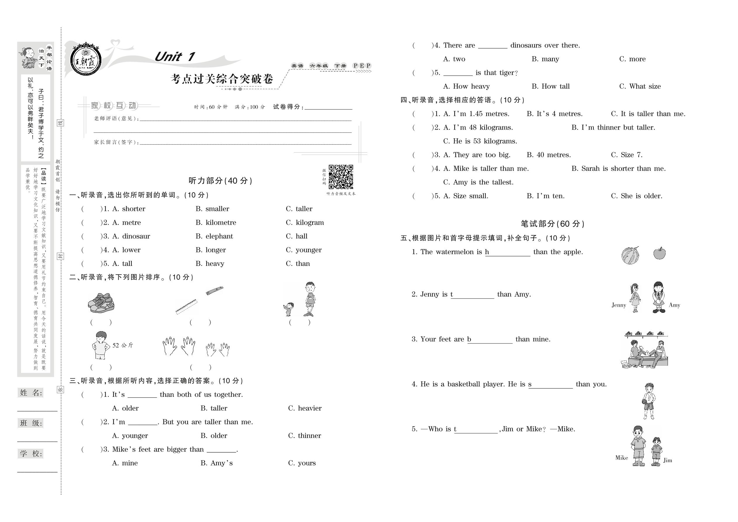 2021下册六年级英语PEP版 Unit 1 考点过关综合突破卷
