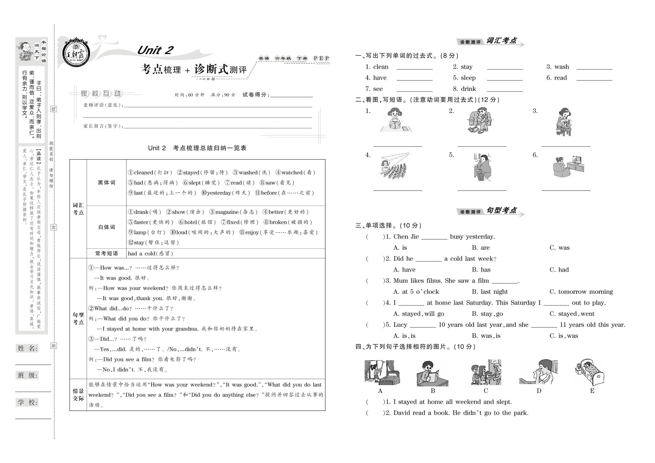 2021下册六年级英语PEP版 Unit 2 考点梳理+诊断式测评